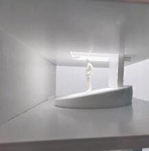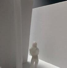 In the tenth photo, a curved vertical surface with a void is shown. The figure stands below the void. The light changes coming from below and above. As I stand near the void and, the curved vertical surface leads my eyes above me. I feel as if I can’t get to the light. It is over my head, and the wall is too hard to climb up.