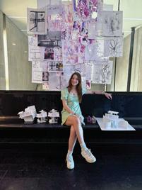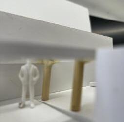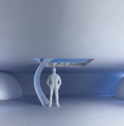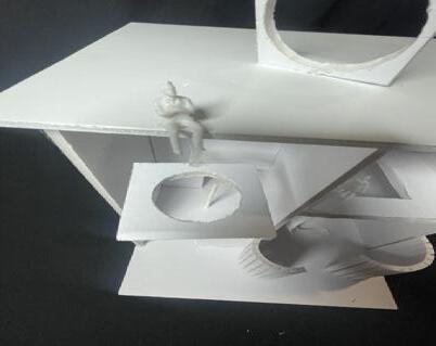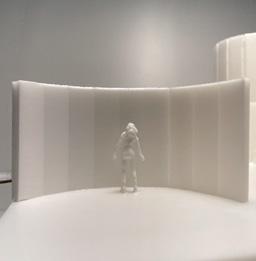 In the fifth photo, there are multiple twisted surfaces without a pattern. The figure stands in front, looking at the surfaces. As I look at the twisted surfaces, it reminds me of a sculpture. It looks abstract and makes me want to keep looking at it. It also makes me feel interested in why they chose to make these twisted and free surfaces. It makes me sad that I am forced to keep moving and can’t stay here.