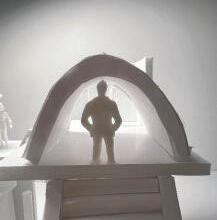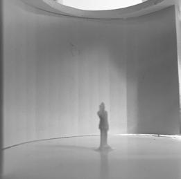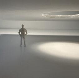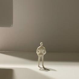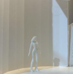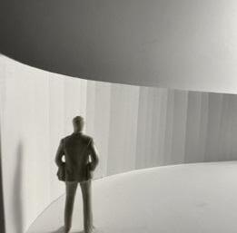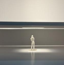 In the eleventh photo, a circular void is in the ceiling, and light is shining through it. The figure stands underneath it. Standing there, I feel scared by the surrounding darkness. The single light makes the space feel lonely, making me feel unhappy yet aware of the destination in front of me.