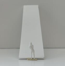 In the third photo, the wall is slants toward the figure. The figure walks toward the wall. The need to duck my head to get around it frustrates me. I must move more to the right to continue forward. This makes me feel even more upset.