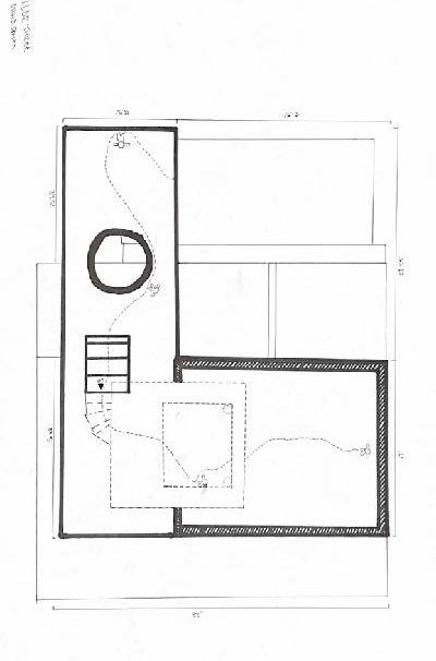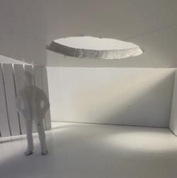In the eleventh photo, a circular void is in the ceiling, and light is shining through it. The figure stands underneath the light. As I stood there, I felt scared by all the darkness surrounding me. There was only one light, and it felt lonely. The openings projected different shapes onto the floor. This made me want to leave and go where the light is.