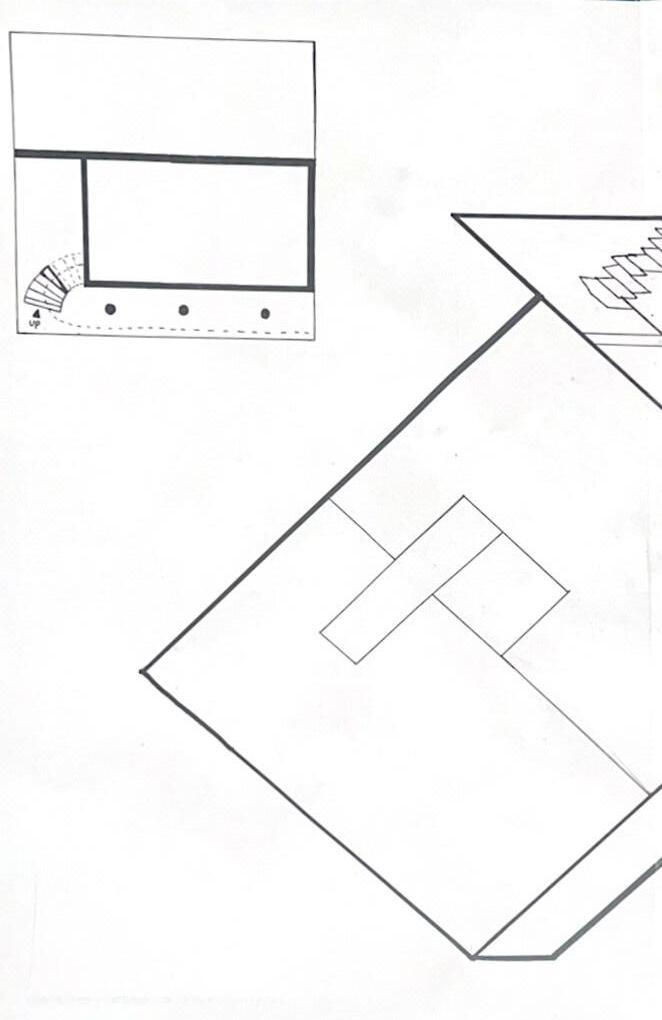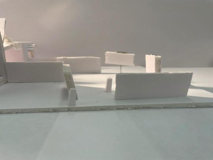 The sixth photo shows a pointed wall in the opposite direction from the figure. The figure views the connected edge of the two walls. The pointed wall gave me a feeling of coldness. The walls created more of a closed-off area. The point of the two lines guided me straight ahead.