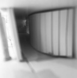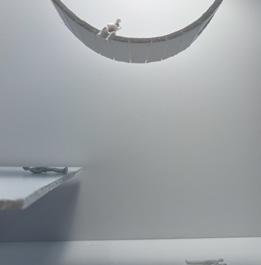 The eighth photo shows two curved walls with a figure in between. The figure stands in the middle and looks as if it is walking through the walls. As I stood in between the walls, I felt very enclosed. I felt as if I had limited space. At this point I felt melancholy but there was an interesting looking ladder in front of me so I decided to climb it.