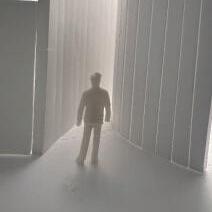 In the seventh photo, the columns, walls, and lighting closes the space off. The figure stays in the same place, looking ahead. The space feels more closed off with the columns on the left and the walls on the other sides. I know I need to keep going because of the light shining through. The columns to the right seem to block off some of the walkway towards the light. The room that I am in feels dark, and I want to escape.