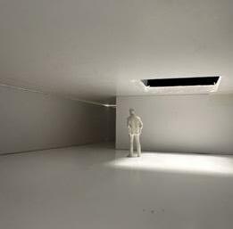 In the eleventh photo, a circular void is in the ceiling, and light is shining through it. The figure stands underneath it. Standing there, I feel scared by the surrounding darkness. The single light makes the space feel lonely. The opening projects a circular shape onto the floor. This made me want to leave and go where the light is.