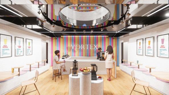 This is a smoothie bar. The back wall is colorful translucent material. The space is light and bright with a reflective ceiling. The sign on the back wall says VORTEX. The tables are light wood.