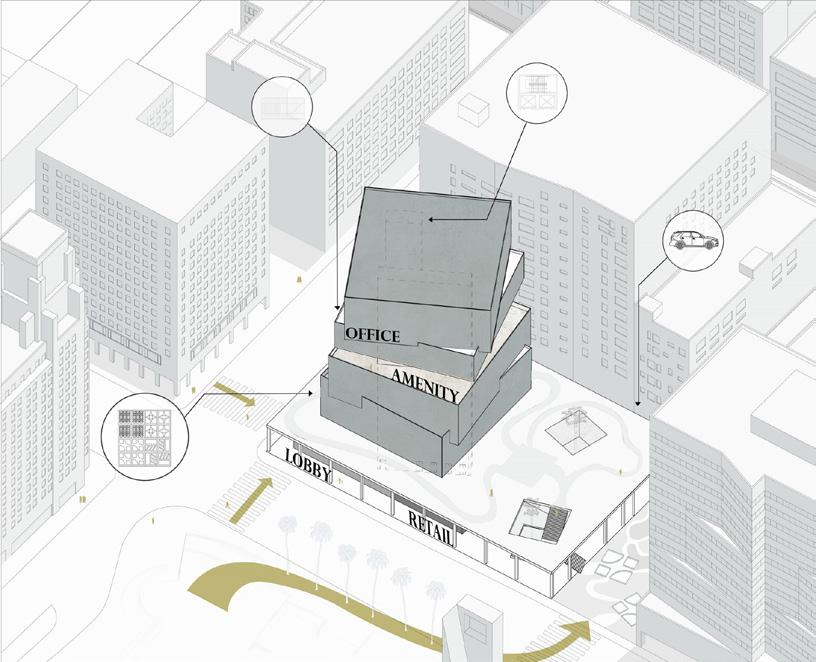 R3’s main relationships to the site are Pershing Square and the Los Angeles Metro. The ground floor, then, becomes about how to create amenities for both the Los Angeles public and the tenants of the building. The public and tenants have access to the coffee shop and restaurant on the ground floor, which turns into a food pantry on the weekend. Only the tenants of the building have access to the gym located on 6th floor. Office spaces consist of desking, meeting/conference, and socializing/ lounging areas, while also consisting of smaller floor amenities located on each office level. Daylight is controlled by the façade strategy. This strategy not only condenses glare and harsh daylight from entering the building, but it also represents the fast pace lifestyle of Los Angeles. Water and ecosystem strategies work together to provide daylight for native plants and work spaces located throughout the building.