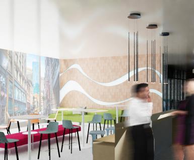 Thrive design will work to employ a sense of prosperity in a two-story space using nature, prioritizing coexistence within the community, and elements that will stimulate creativity. The hub is further connected to the Seaport District through a kaleidoscope of colors from Spanish Contemporary Artist, Okuda San Miguel, and his monumental sculptures lining Seaport Boulevard. In this office space one there are playful furnishings, natural materials, nested spaces, ambient lighting, and many vibrant colors.