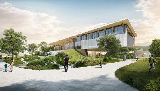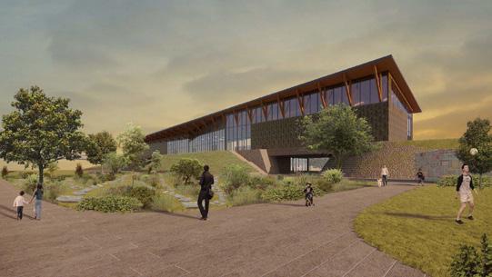 A building built on a hill. Metal facade and windows. Stone pathway with planters and seating.