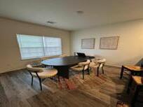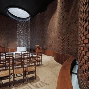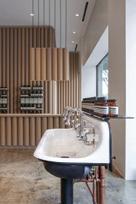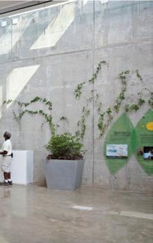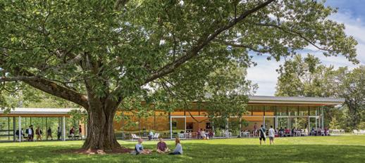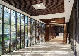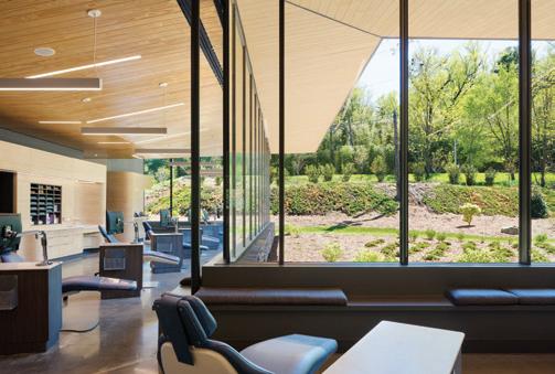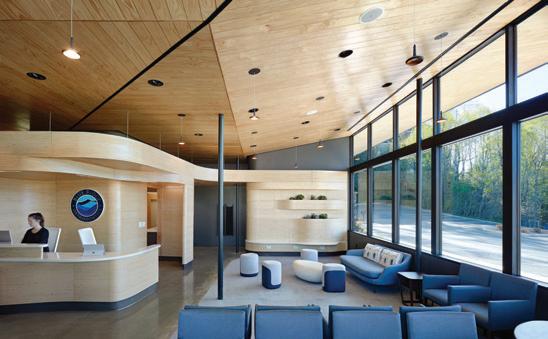 This s space e heavily y highlights s the e natural l building, , as s well l as s the e comfortable e seating g reminiscent t of f a home. . The e room m shows s access s to o water r and d the e greenery y in n the e space.