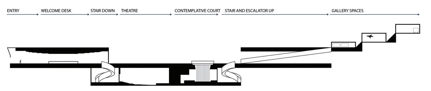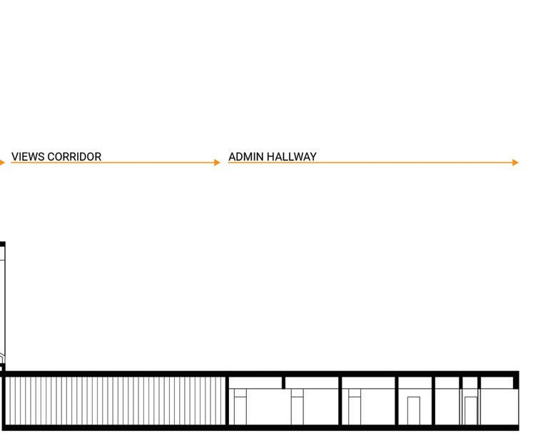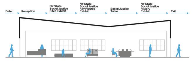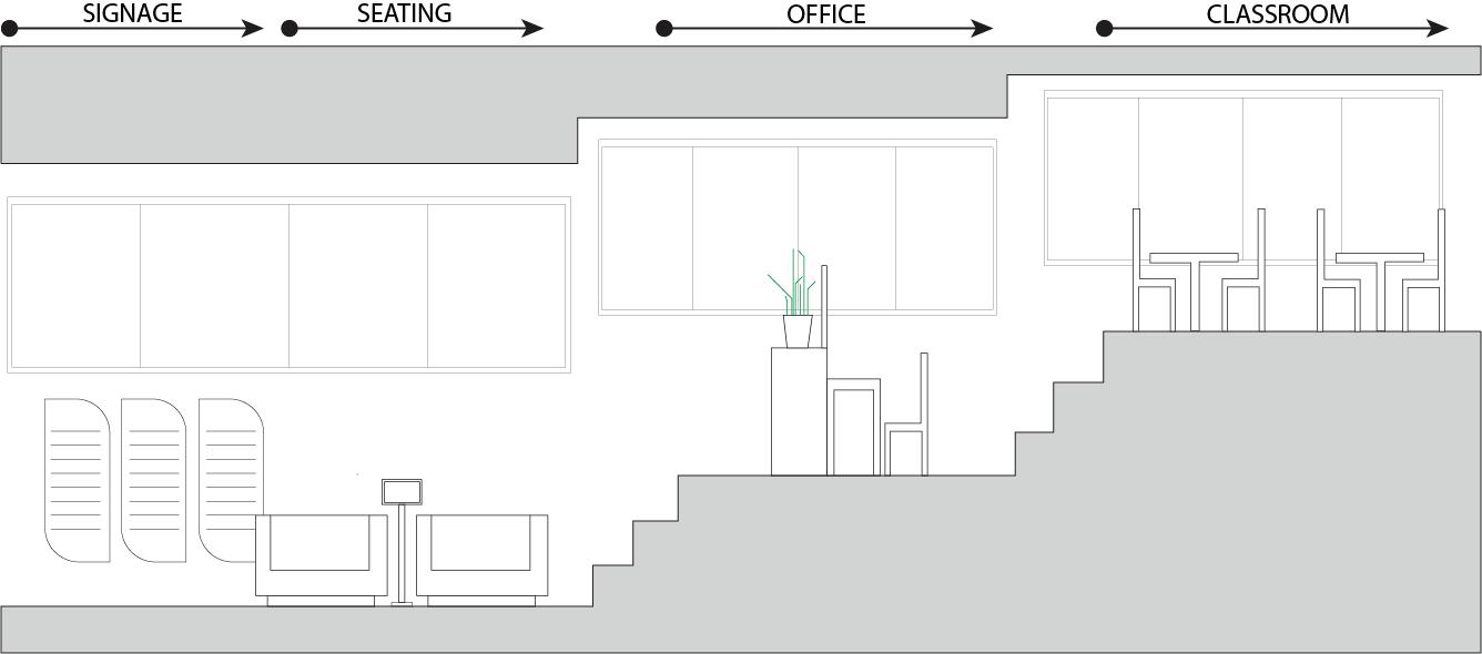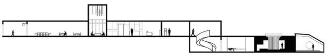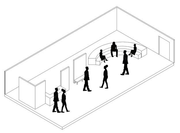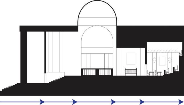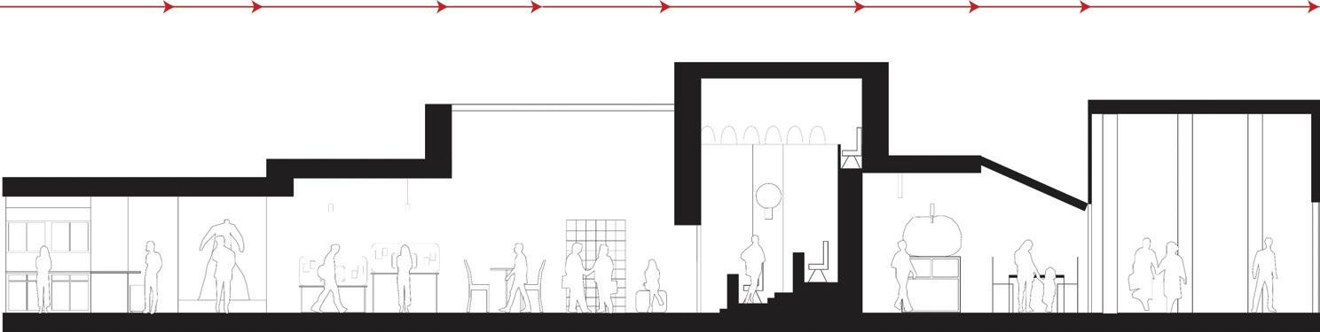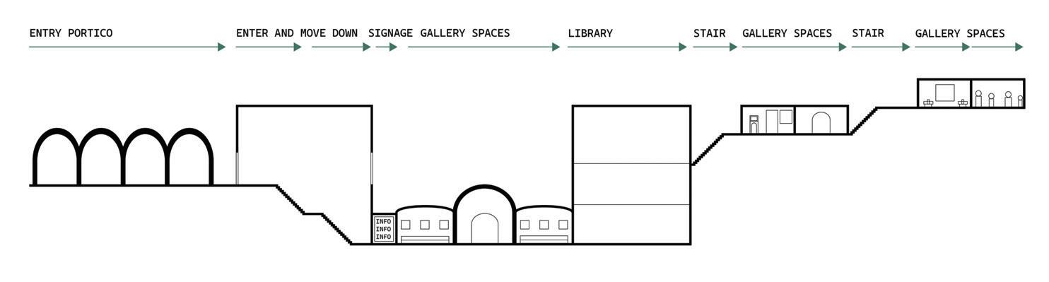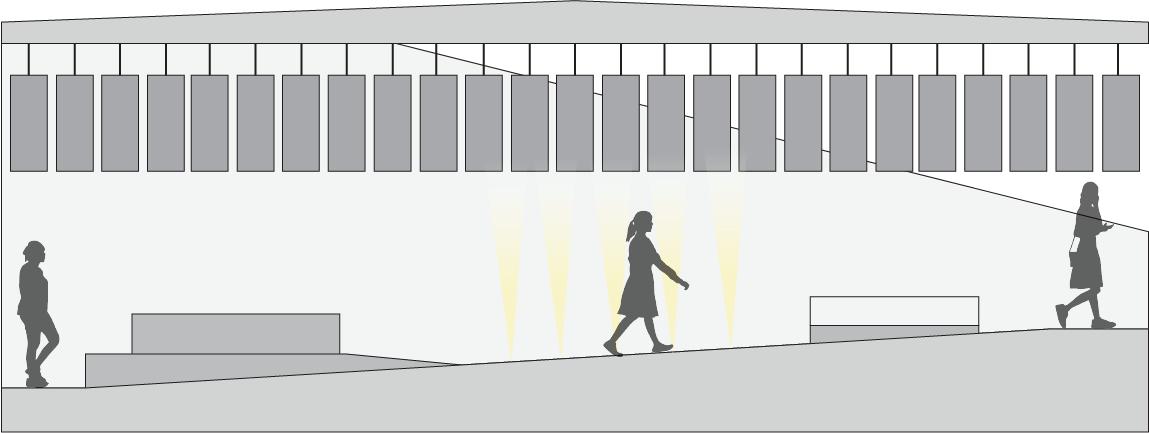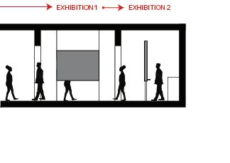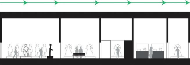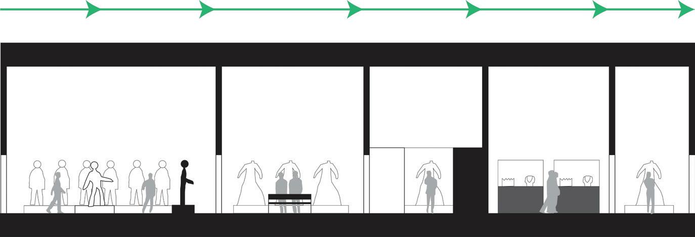 The space will guide people throughout without too much signage having to guide them through the space. There are areas for rest in the area but it is not the main focus, the main focus is to view the art and continue through to be able to see everything on display within the area. The space is open in some areas and a little more compact in others to accommodate different exhibits that may pass through.