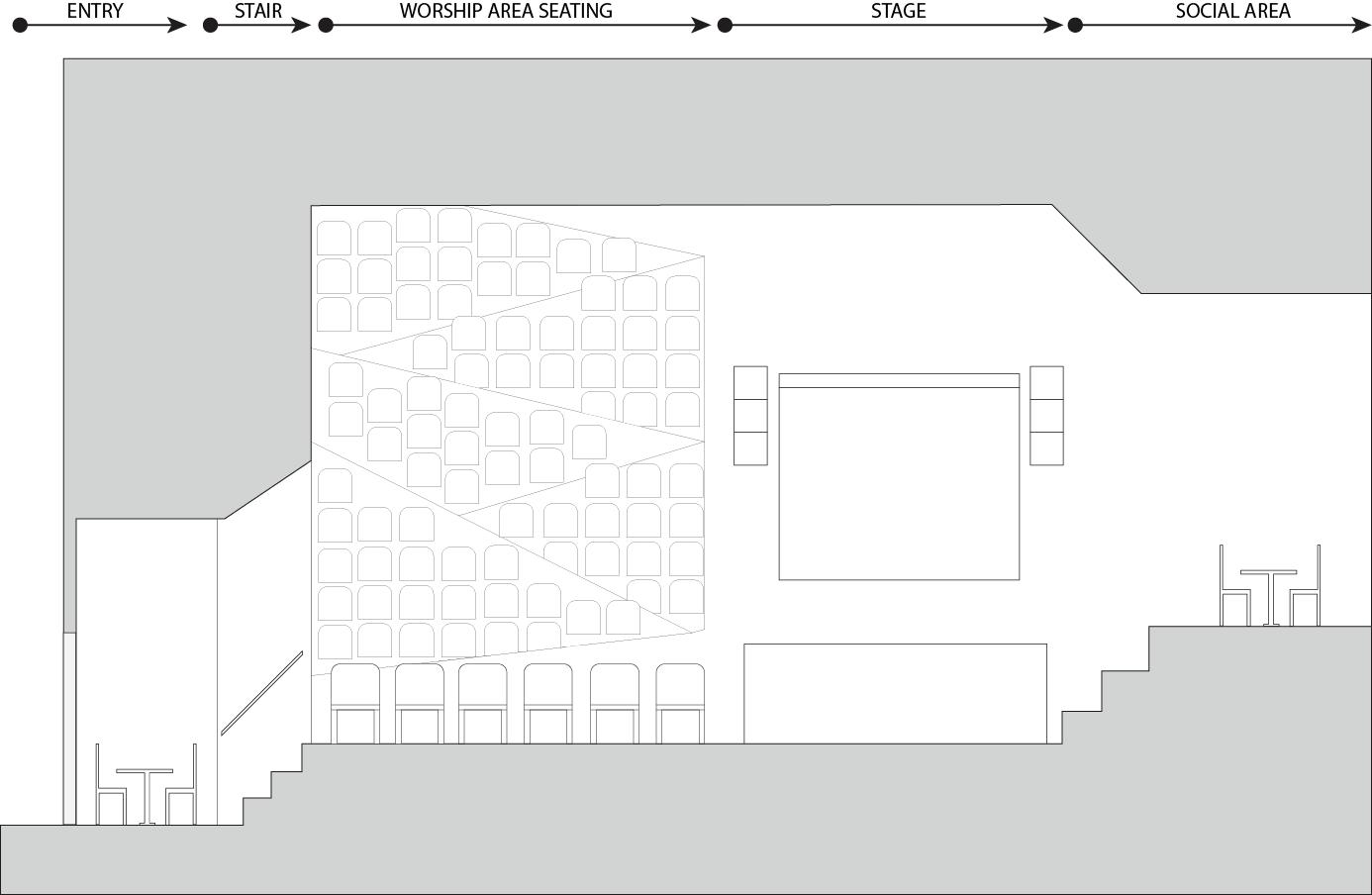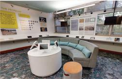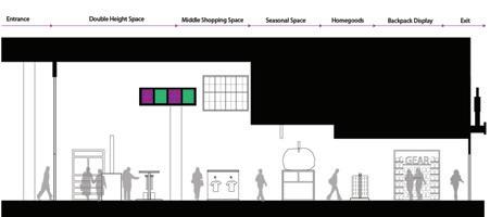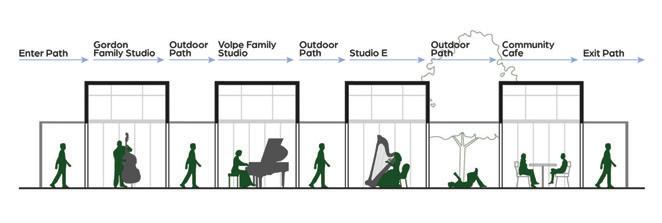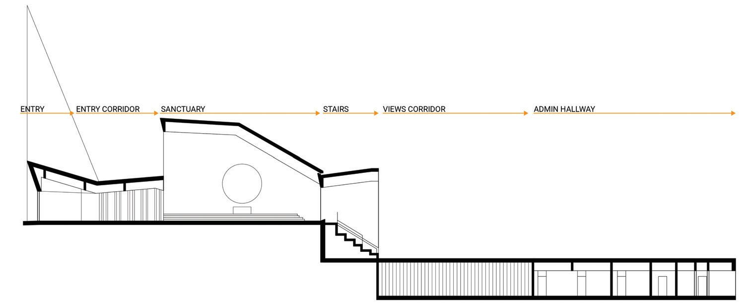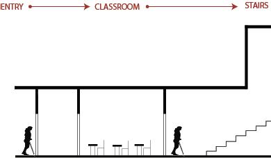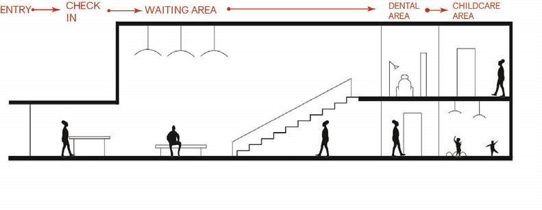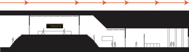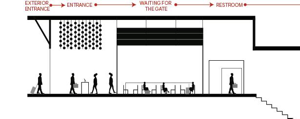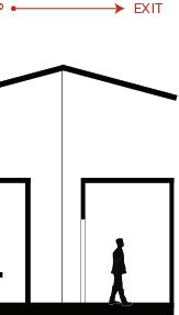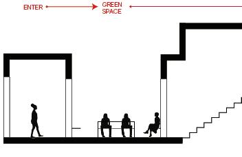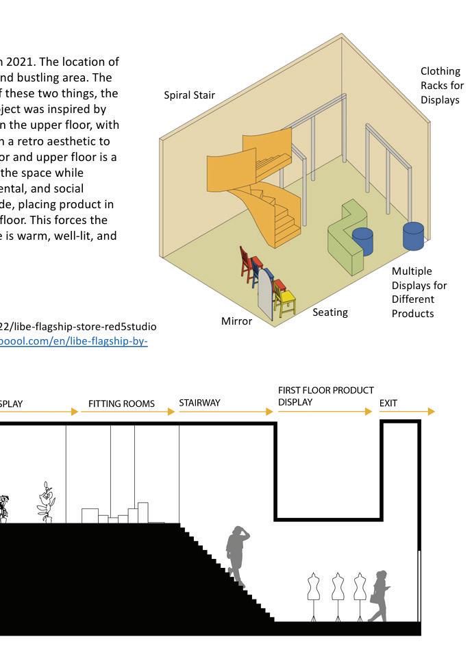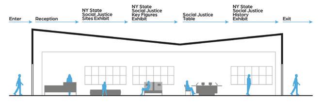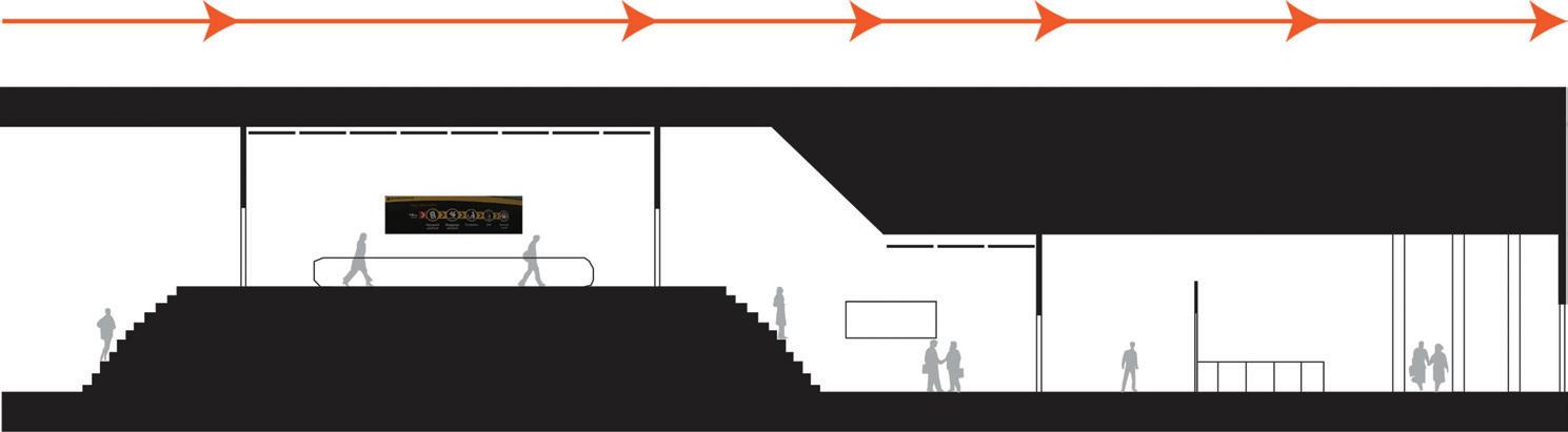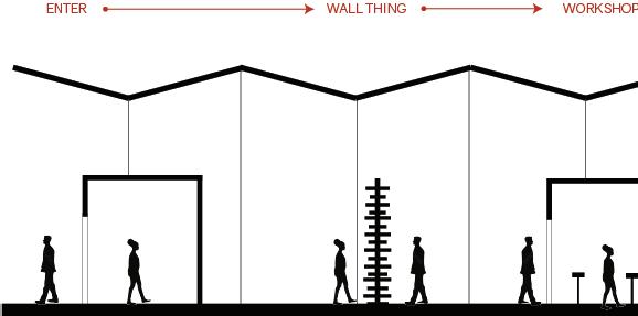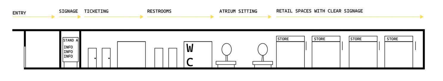 The space will guide people throughout without too much signage having to guide them through the space. There are areas for rest in the area but it is not the main focus, the main focus is to view the art and continue through to be able to see everything on display within the area. The space is open in some areas and a little more compact in others to accommodate different exhibits that may pass through.