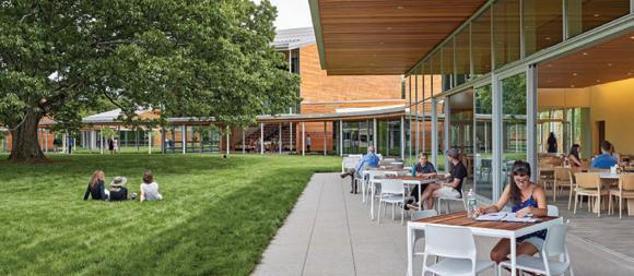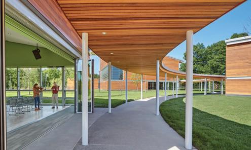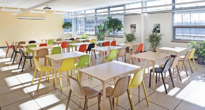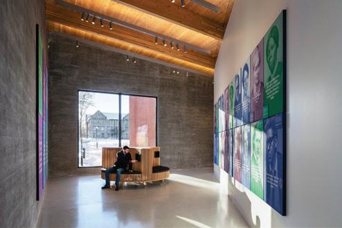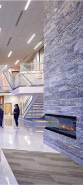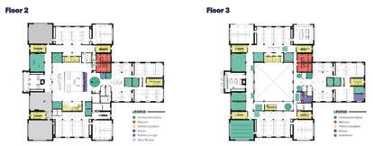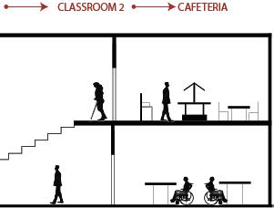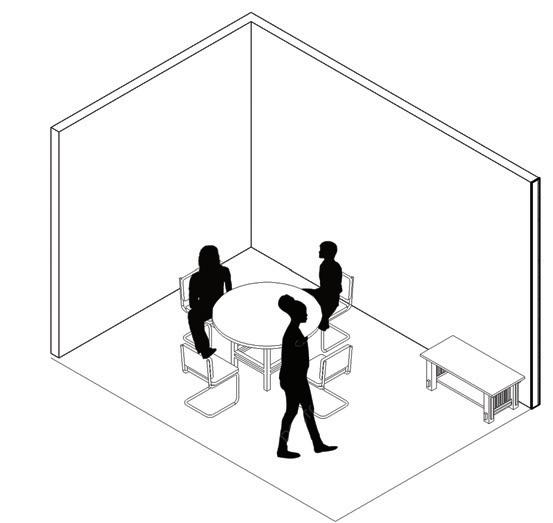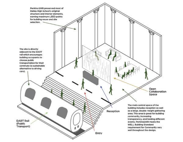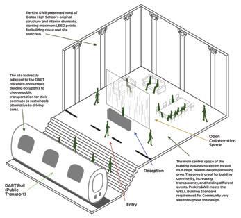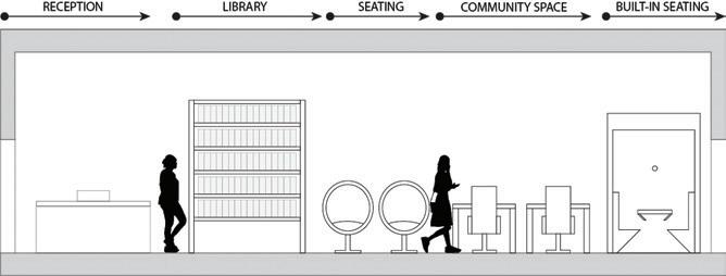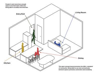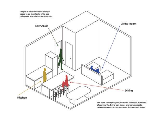In this space, the design simplifies a person’s desire and ability to lead a healthier lifestyle. It encourages people to adapt the space to their needs, wanting them to feel as comfortable as possible within the space. It encourages people to engage with each other through its comfortable settings reminiscent of a home, letting them engage in comfort and conversation. The space highlights the natural building and promotes utilizing spaces as they are and not being wasteful. There is also abundant natural lighting, promoting well-being through the daylight being a primary focus within the space. There are water bottle filling stations, storage, and bike racks that make sustainable and healthy lifestyles simple for the people inhabiting the space.