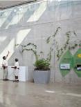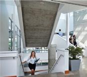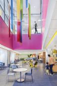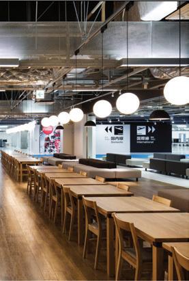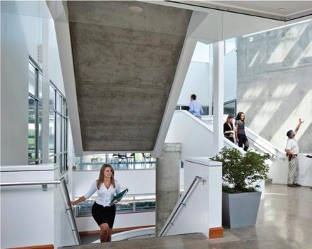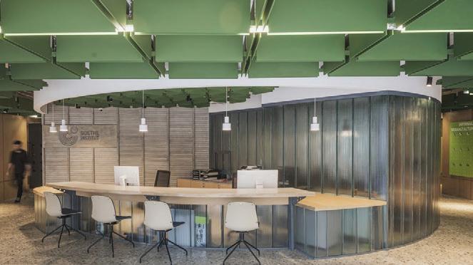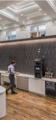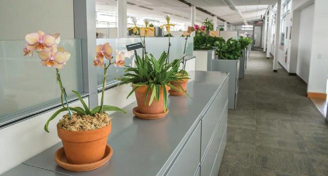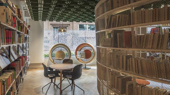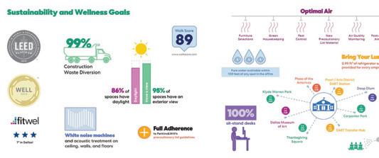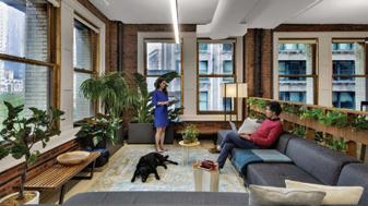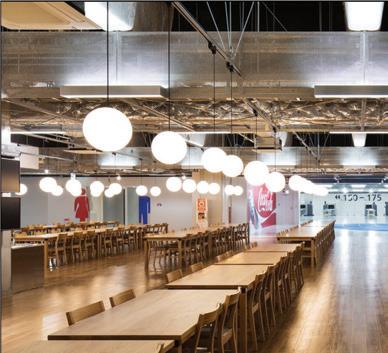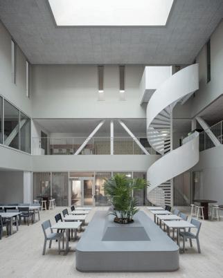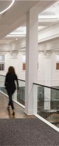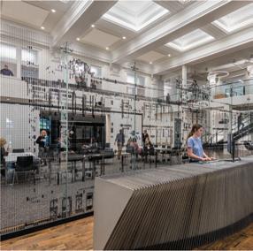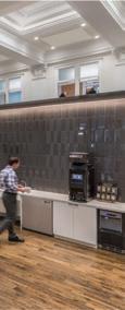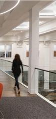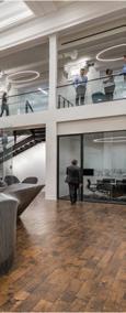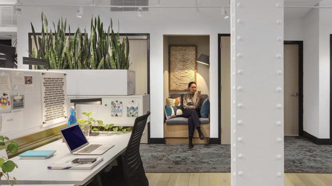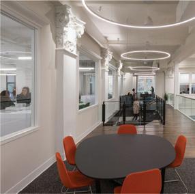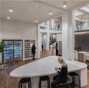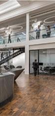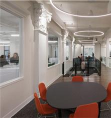 The space incorporates lots of greenery to make the people within the space feel more comfortable and promote healthier standards. There is a lot of exposure to natural sunlight through abundant windows, and it maintains a lot of the integrity of the original building.