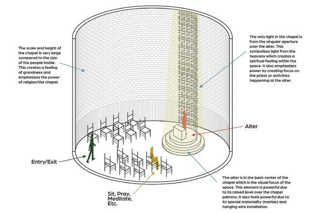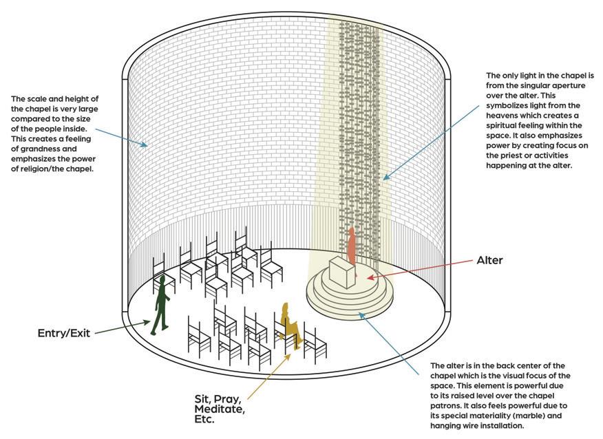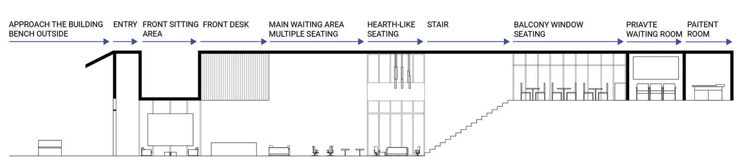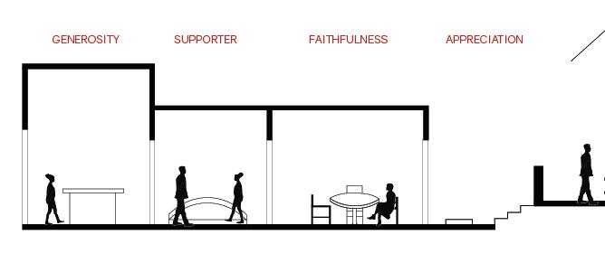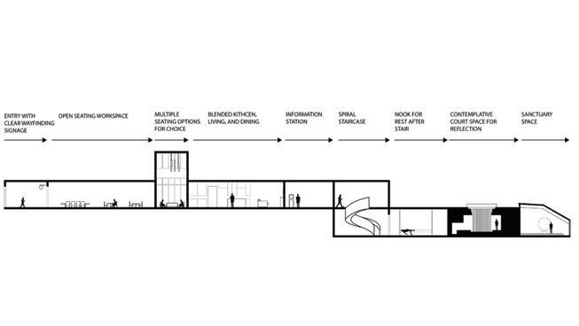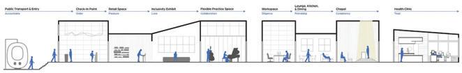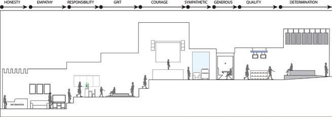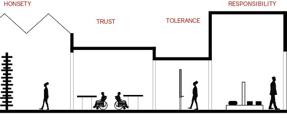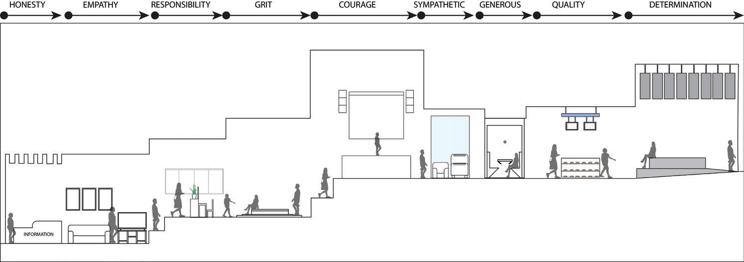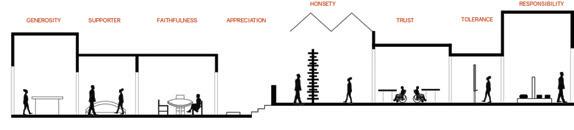 The reliable section of the sequence has seating for socialization, is laid out in a way that accommodates an average person, and has sunlight from the windows in the space trickling in (Maxx Designers). The cheerful section leads a person into the next section of the building, it displays interesting artifacts to look at, gives people something to talk about, and has signage to assist w ith wayfinding ( Walshaw ). The attentive section has a space for working, with lots of natural light and greenery to help people, as well as height adjustable desks and task chairs to accommodate different levels of comfort. It also is very open, allowing convers ati on and connection (WELL Building Standard). The upbeat section is a socializing space with chairs and tables scattered throughout. It is double height allowing people to have a different sense of scale from the other locations. It has lighting from above and lar ge windows surrounding it (Henderson). The good section is a place for people to come together and help each other. It is a location with different things available to the people who come and visit the space. People can interact with each other, give each ot her things, and help with life events. The space is cozy and comforting, helping people feel safe in the space. It is bright and inv iting through greenery and natural light (USA Shade). The trust section raises people up, giving them height over their peers. It establishes power but is also open enough to allow trust. It is in an open double height space, allowing people to feel impor tant. It is open for communication, and it has windows around the top letting sunlight trickle in ( Archspace). The reputable section is a section to stop and take in. The display shelf holds interesting artifacts, making for conversation. The shelf is a little bi t taller than a person, giving it importance. It is an open space, connecting to the outdoors and the next section (World). The sympathetic section is the next outdoor section. It has a direction connection to nature, with only a small awning to shade from the sun. This se ction is largely for socialization, with plenty of chairs and tables and adaptable to different formats for different types of gatheri ngs . The space is adaptable to fit everyone and whatever needs are needed at the time (Akanni). The authentic section is the exit to the space, where you see yourself out. It allows for one last stop and pause before you exit a space. It also directs you to your next location, with signage located around the space to guide you. It is a direct connection into the environment. There are space s to stop and converse with the people you met along the way through the space and have a final conversation before you go your separate ways (Berti).