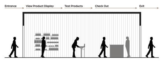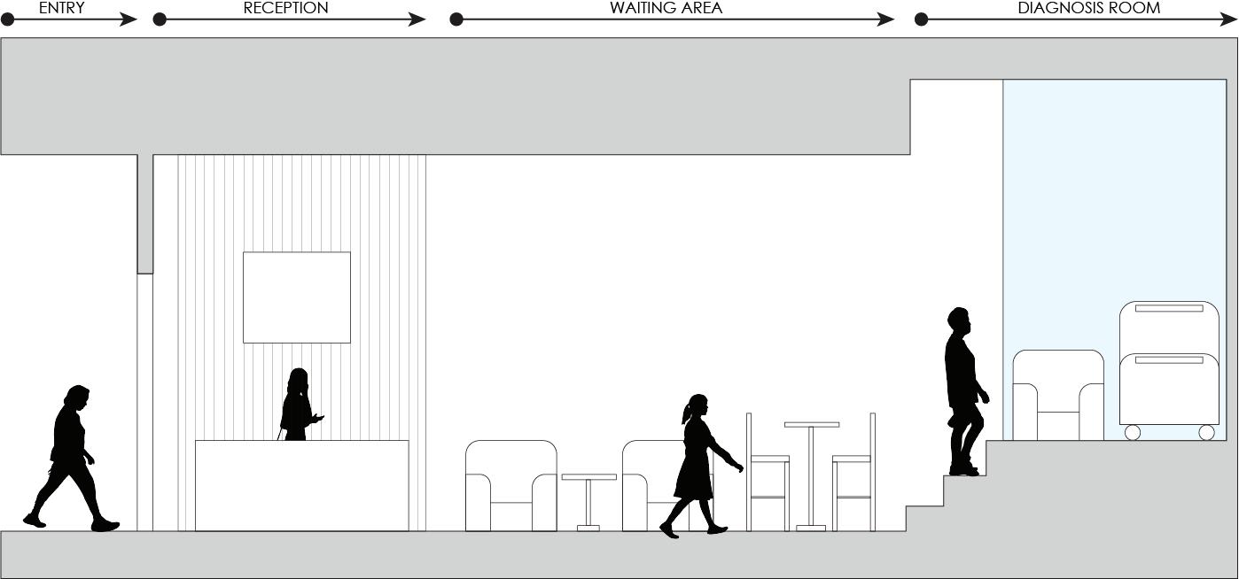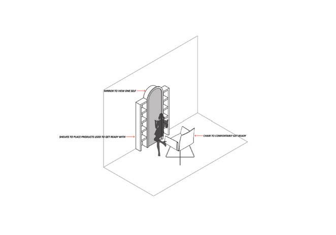 As you move toward the center of the space, compassion is subtly woven in There are places to sit if you need a break, mirrors that reflect without judgment, and lighting that flatters rather than exposes This space recognizes that getting ready is not always just about appearance It can also be about building confidence, healing, or preparing for difficult moments The environment offers quiet support, acknowledging the social and emotional realities we carry with us.