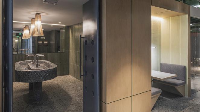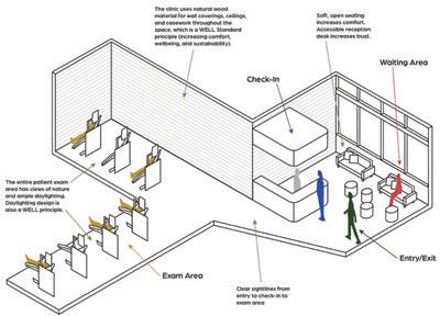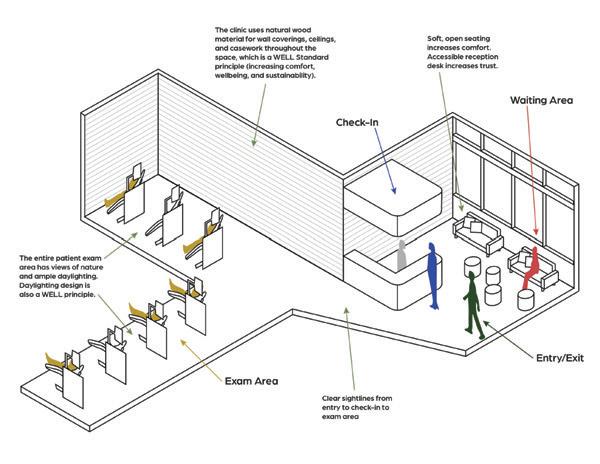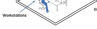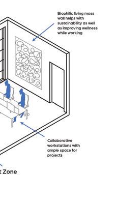 The space utilizes a lot of the Well Standards to help people working in the area. The space uses lighting that encourages natural rhythms within people and texture to help with following patterns and recognition within the space.