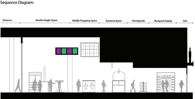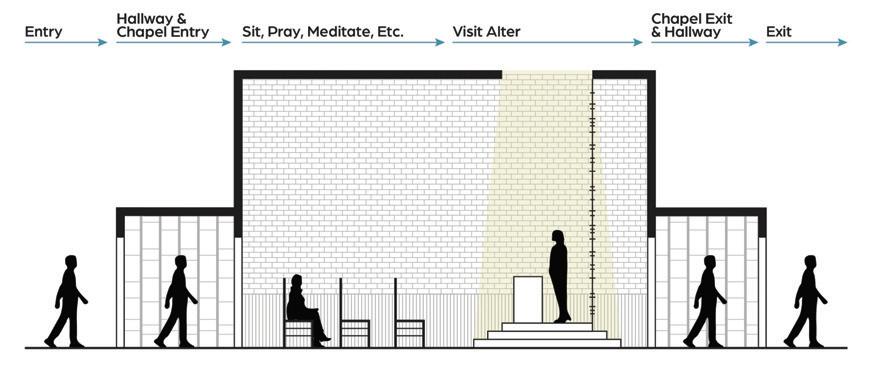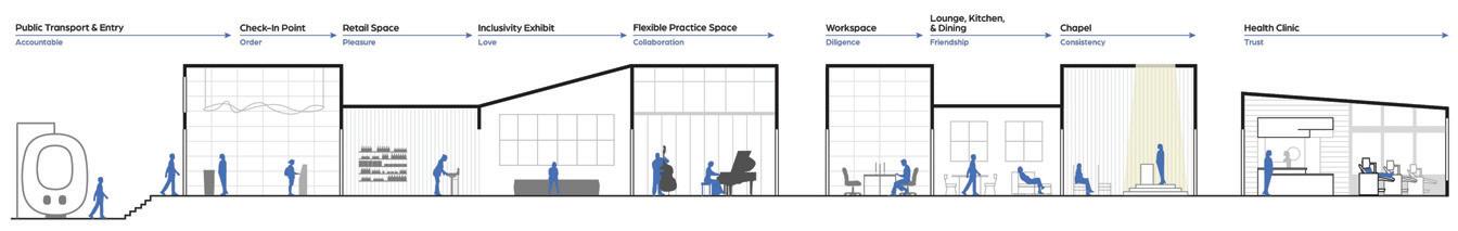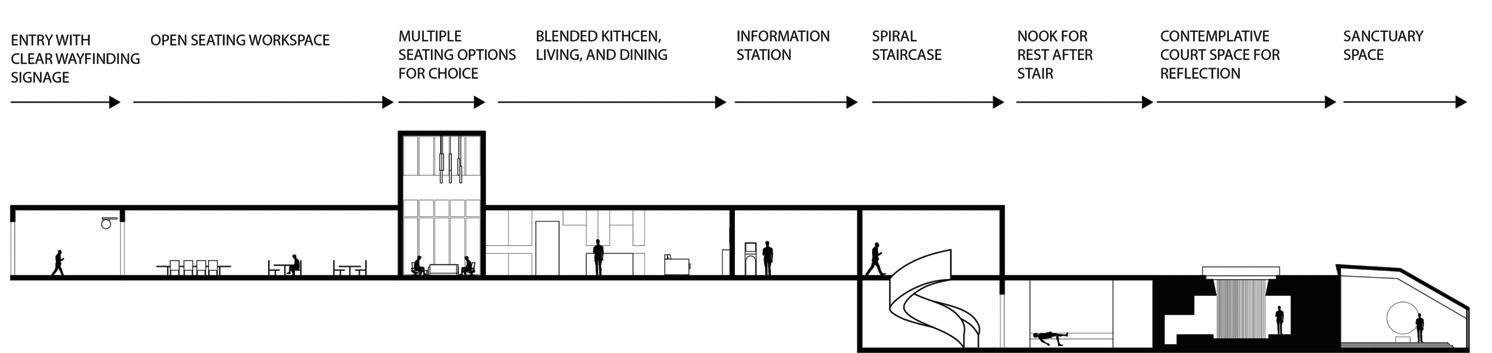 The reliable section of the sequence has seating for socialization, is laid out in a way that accommodates an average person, and has sunlight from the windows in the space trickling in (Maxx Designers). The cheerful section leads a person into the next section of the building, it displays interesting artifacts to look at, gives people something to talk about, and has signage to assist with wayfinding (Walshaw). The attentive section has a space for working, with lots of natural light and greenery to help people, as well as height adjustable desks and task chairs to accommodate different levels of comfort. It also is very open, allowing conversation and connection (WELL Building Standard). The upbeat section is a socializing space with chairs and tables scattered throughout. It is double height allowing people to have a different sense of scale from the other locations. It has lighting from above and large windows sur rounding it (Henderson). The good section is a place for people to come together and help each other. It is a location with different things available to the people who come and visit the space. People can interact with each other, give each other things, and help with life e vents. The space is cozy and comforting, helping people feel safe in the space. It is bright and inviting through greenery and natural light (USA Shade). The trust section raises people up, giving them height over their peers. It establishes power but is also open enough to allow trust. It is in an open double height space, allowing people to feel important. It is open for communication, and it has wind ows around the top letting sunlight trickle in (Archspace). The reputable section is a section to stop and take in. The display shelf holds interesting artifacts, making for conversation. The shelf is a little bit taller than a person, giving it importance. It is an open space , connecting to the outdoors and the next section (World). The sympathetic section is the next outdoor section. It has a direction connection to nature, with only a small awning to shade from the sun. This section is largely for socialization, with plenty of chairs and tables and ad aptable to different formats for different types of gatherings. The space is adaptable to fit everyone and whatever needs are needed at the time (Akanni). The authentic section is the exit to the space, where you see yourself out. It allows for one last stop and pause before you exit a space. It also directs you to your next location, with signage located around the space to guide you. It is a direct connecti on into the environment. There are spaces to stop and converse with the people you met along the way through the space and have a final conversation before you go your separate ways (Berti).