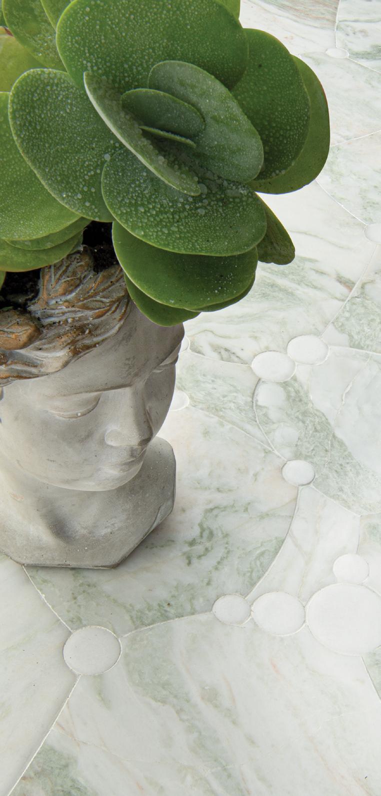 Cean Irminger, New Ravenna’s creative director, says of Biome, “Our natural world is a major source of inspiration and solace. When palette and pattern overlap, we can completely change the perception of a design; a pattern that was based on a fossil from the desert now reads as a meadow flower in white and green, or a falling snowflake in white and gray. On a grand scale, Biome reveals the interconnectedness of nature and design. When examined closely, Biome illustrates the chameleon quality of mosaic and its ability to express a narrative through color.”