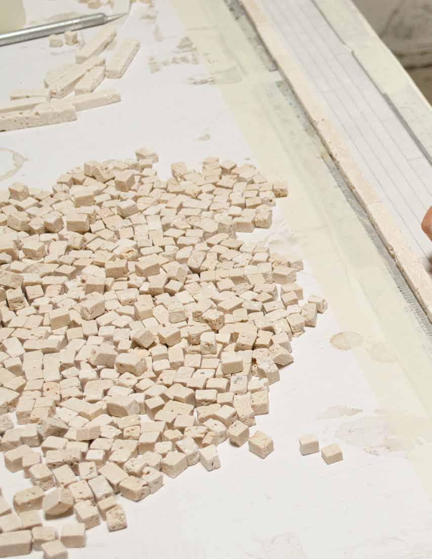 Flatweave in tumbled Allure, Driftwood, Cavern, Bianco Antico, Lagos Gold, and Botticino. Designed by Paul Schatz for New Ravenna.