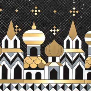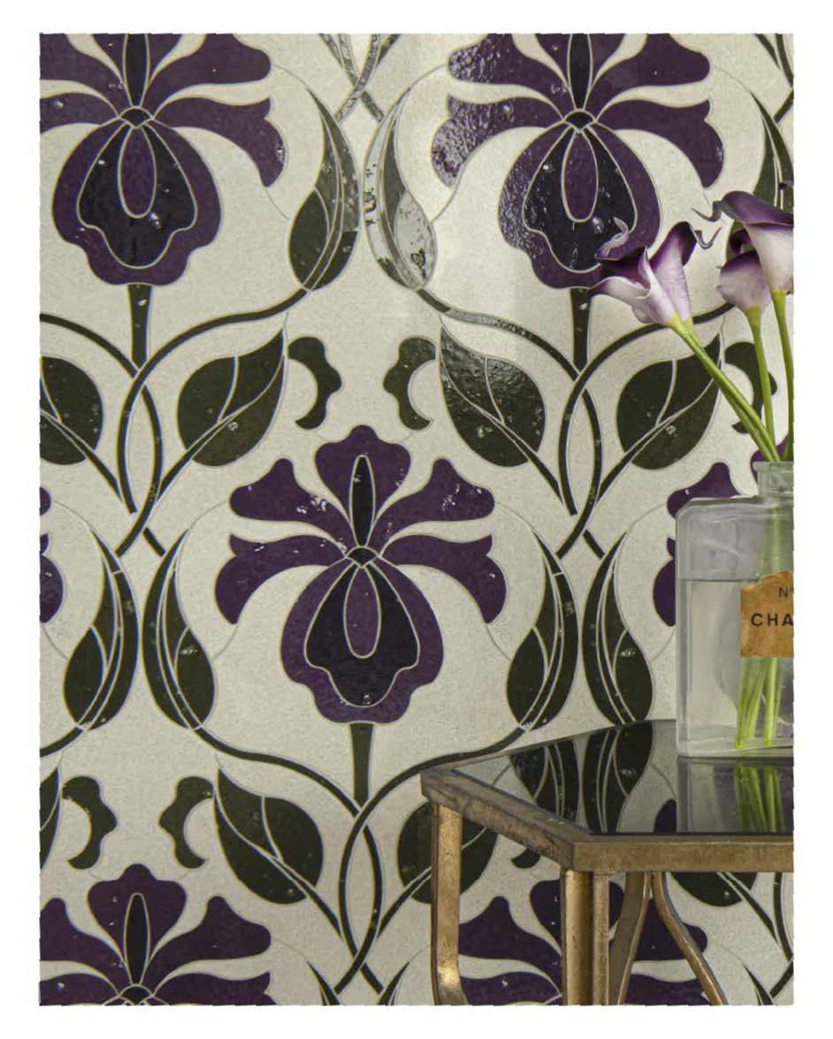 Night Lights in honed Nero Marquina, Indigo, Orchid, Fern and Sweetgrass, polished Aurum, Thassos, and Nero Marquina. Designed by Cean Irminger for New Ravenna.