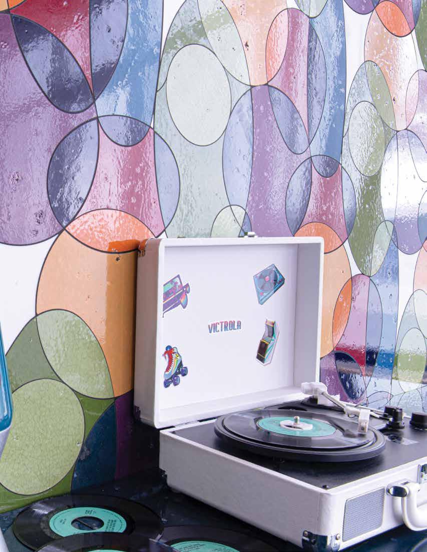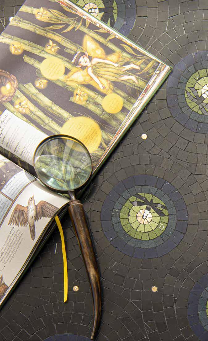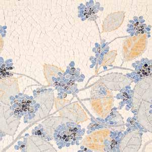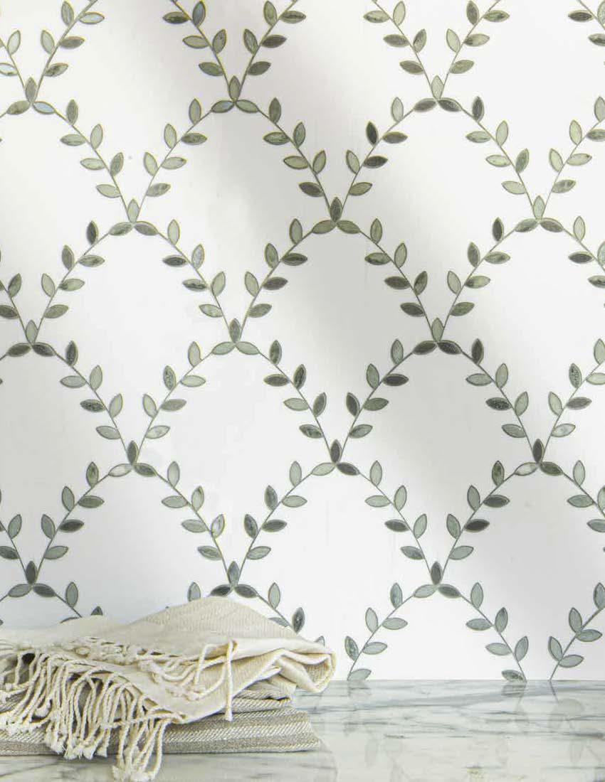 12” Linda’s Garden in jewel Agate, Amber, Citrine, Peridot, Alexandrite, Jade, Schist, Lavastone, Tourmaline, Labradorite, Zircon, Jasper, Champagne, Opal, and Moonstone with Sea Glass™ Serpentine. Design by Gracie Wallpaper.