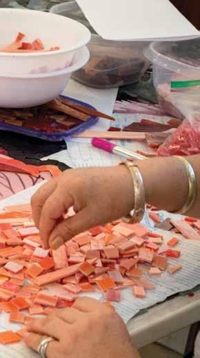 Granny Squares in tumbled Zinnia, Tiger Lily, Goldenrod, Sweetgrass, Hydrangea, Orchid, Iris, and Nero Marquina. Designed by Cean Irminger for New Ravenna.