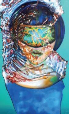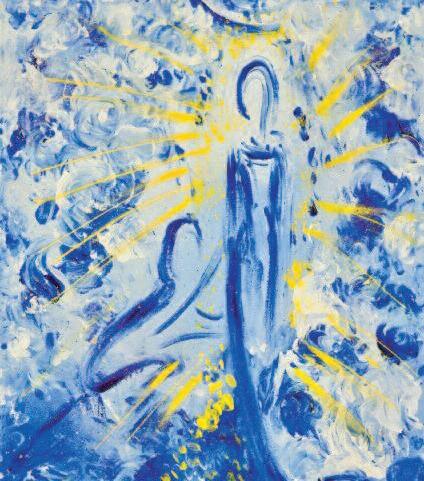 Le bleu, symbole de spiritualité, prédomine dans mes oeuvres Mais d’autres couleurs, comme le jaune ou le rouge, peuvent également apparaître Je me considère comme une artiste visionnaire: les anges me parlent et la peinture me permet de transmettre leurs messages, d’où les mots sont absents Pour moi, la peinture est le langage de l’âme