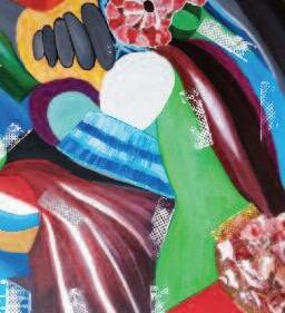 La réalisation d’une toile à quatre mains répond à un questionnement purement créatif entre deux sensibilités différentes Dans notre cas, l’abstrait pour Chantal, peintre plasticienne qui me confie son travail, la confiance qu elle m ’accorde n ’est pas sans provoquer chez moi qui suis peintre figuratif, un besoin de réflexion plus poussé que lorsque j’entreprends un travail sur une toile vierge