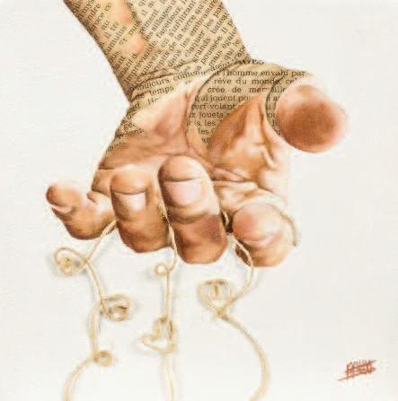 La ficelle, tissée dans la toile, représente le lien qui fait que l'un ne va pas sans l'autre