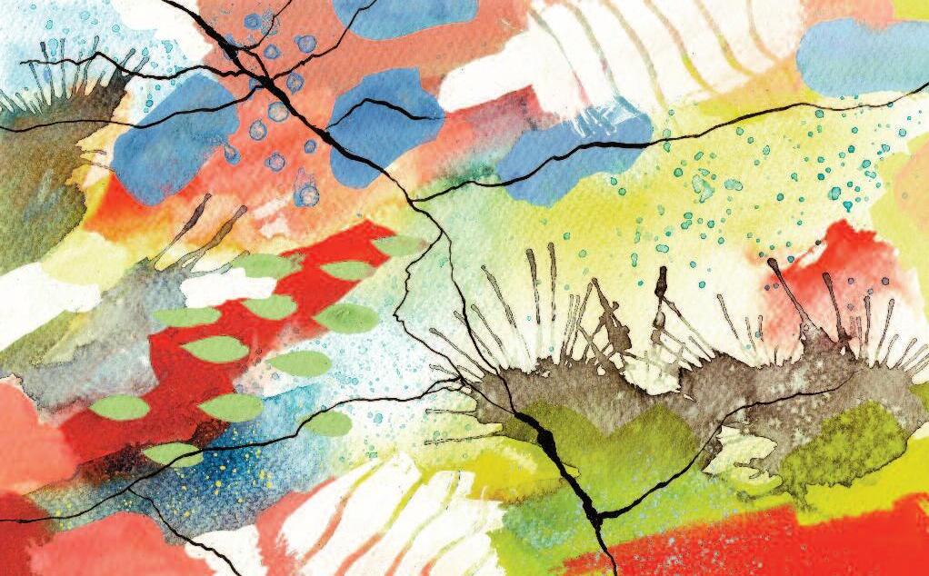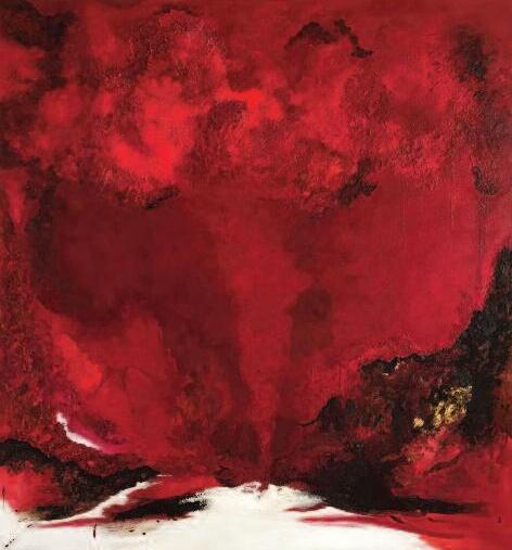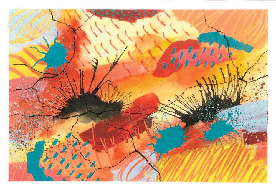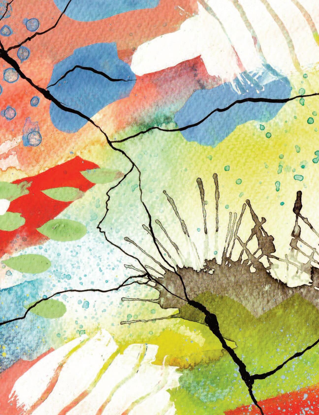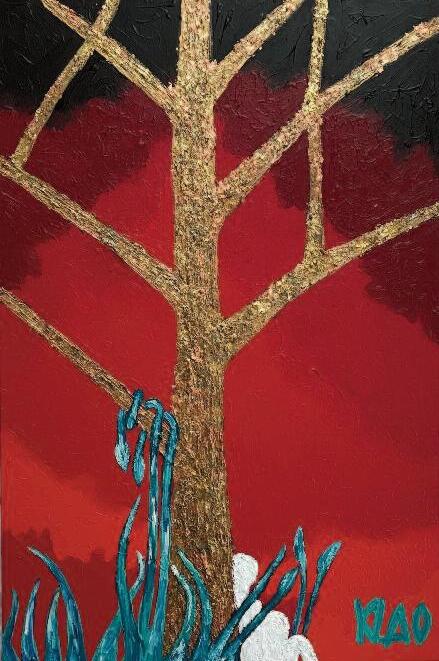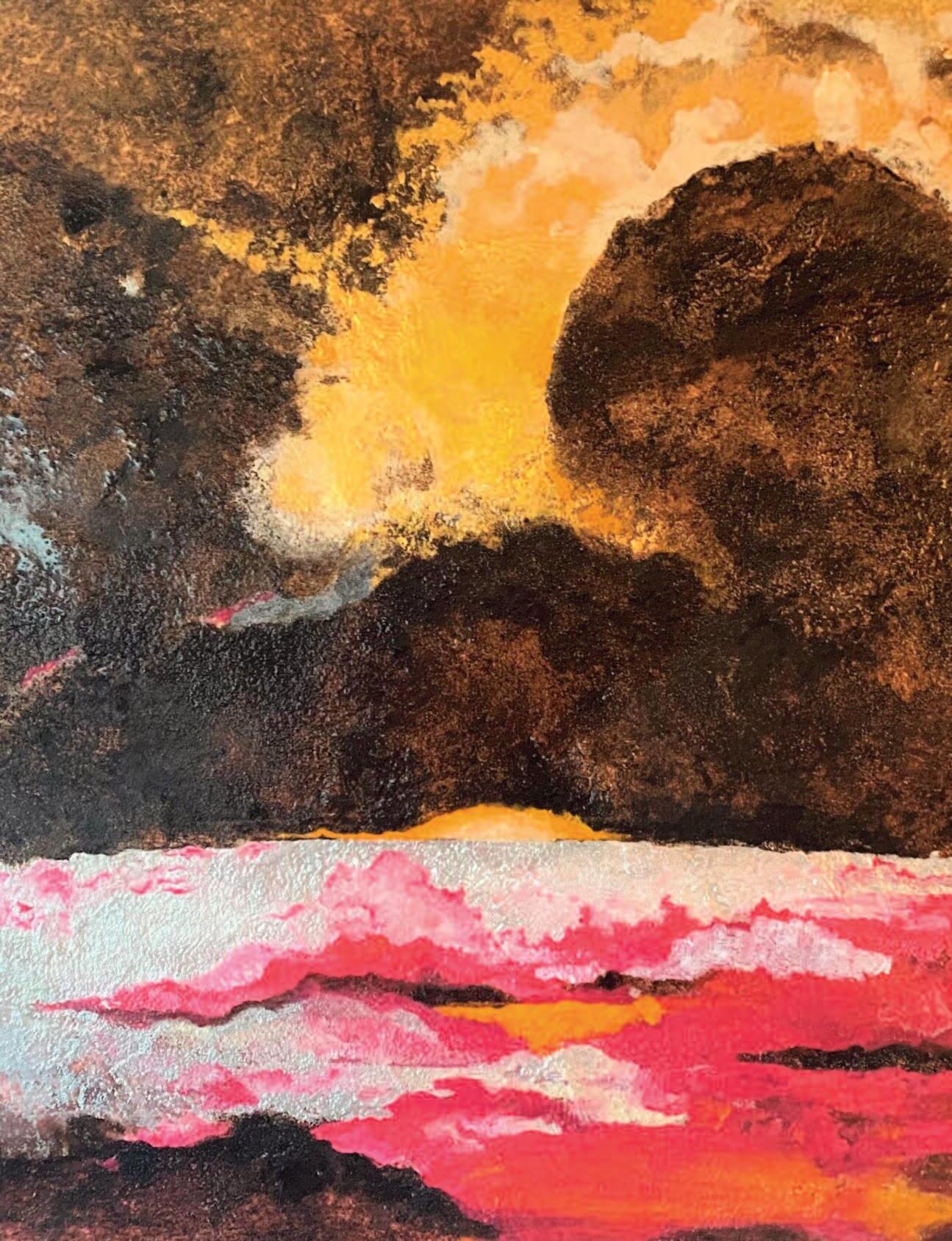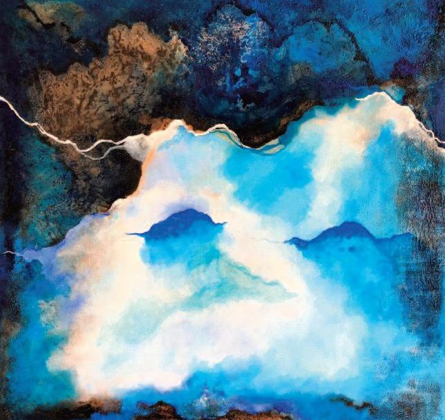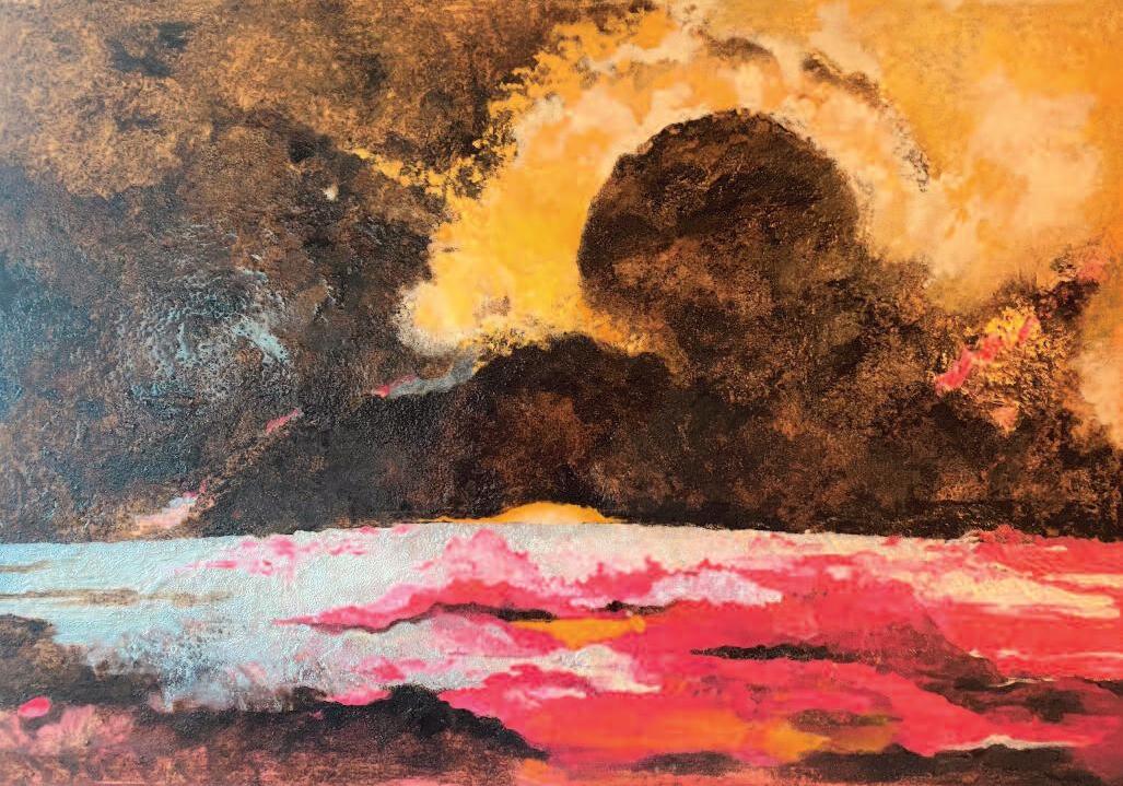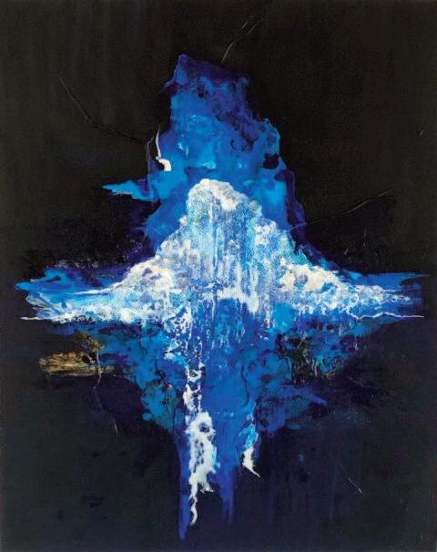 Dernièrement, j’associe à ces techniques de l’encre de Chine, de l’encre acrylique, de la peinture de pouring pour apporter des consistances hétérogènes ainsi que l’ajout de collage de feuilles dorées et argentées