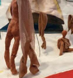 Mon espace pictural ressemble souvent à un laboratoire se consacrant à l’hybridation En combinant des techniques, des matières ou des idées, je tente de découvrir d’où vient l’humain et où il va