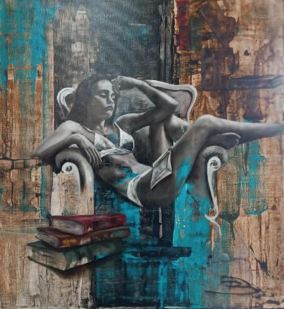essentiellement à l’huile, Ralph S peint toutes les nuits, entre éveil et sommeil, une manière de lâcherprise et de laisser ses émotions s ’exprimer pleinement sur la toile L’évolution du monde, la société, la condition féminine… Le peintre allie toujours peinture et philosophie, accompagnant le spectateur sur le chemin d’une réflexion aussi libre qu’intime et profonde