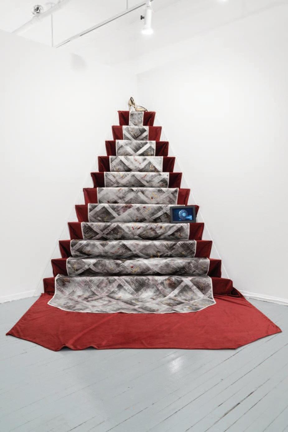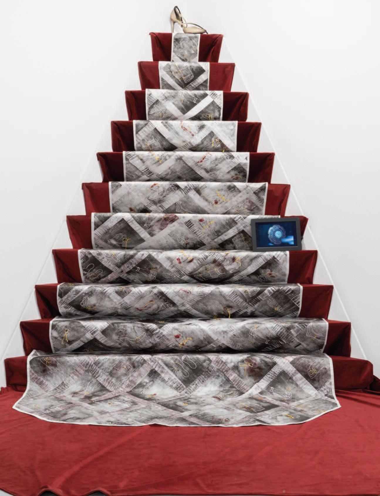 Mon exploration se fait à l’aide de différents médiums : peinture, estampe, textile, art numérique et installation Ces derniers se combinent dans un corpus d’œuvres qui examinent ce qui constitue l’essence de l’humain, son identité et son patrimoine distincts de ceux du règne animal ou de l’intelligence artificielle