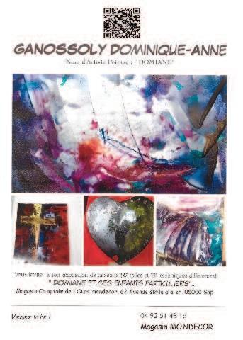 Captivée par l'art dès son plus jeune âge, Dominique-Anne s'intéressera très tôt à la peinture et aux résultats que donnent, tous les produits une fois mélangés, qu'elle met dans ses toiles et autres supports Dans un seul tableau, tu peux en voir plusieurs à condition que tu le tournes dans tous les sens, « habitez moi mentalement, mon voyage est permanent » , c'est sa phrase depuis 1998