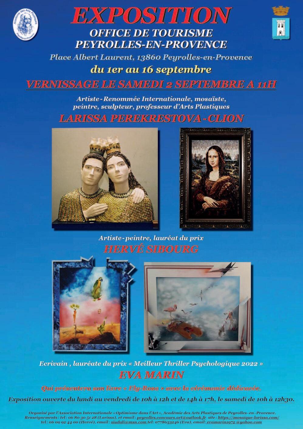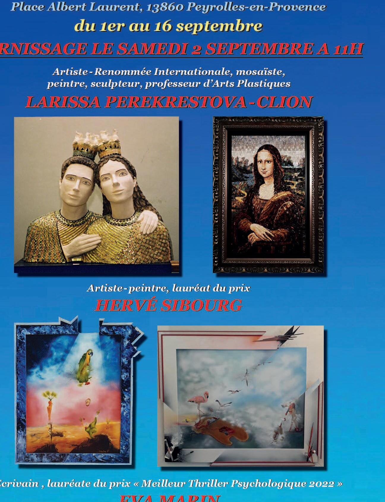 Larissa, son collaborateur artiste-peintre surréaliste Hervé Sibourg et écrivain Eva Marin vous invitent au vern ssage de leur prochaine exposition- présentation le 2 septembre à 11h 30 à l Office de Tourisme de Peyrolles-en-Provence L'exposition est ouverte du 1 au 16 septembre du lundi au vendredi de 10h à 12h et de 14h à 17h et le samedi de 10h à 12h30