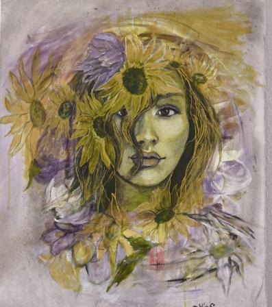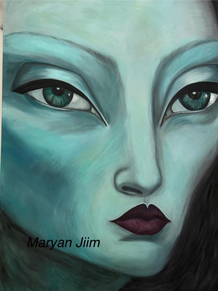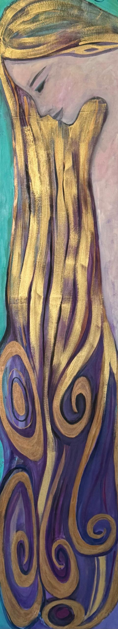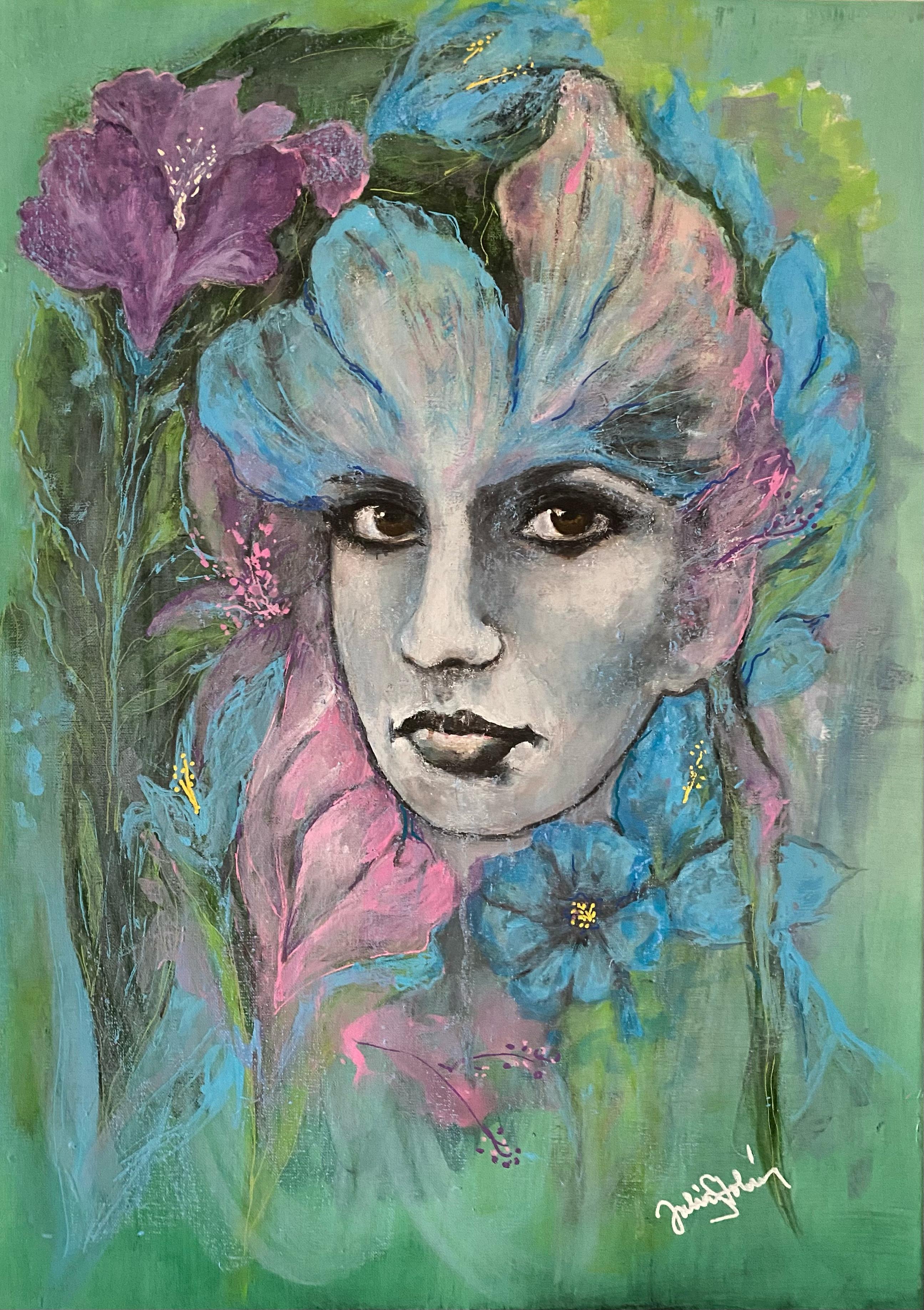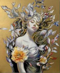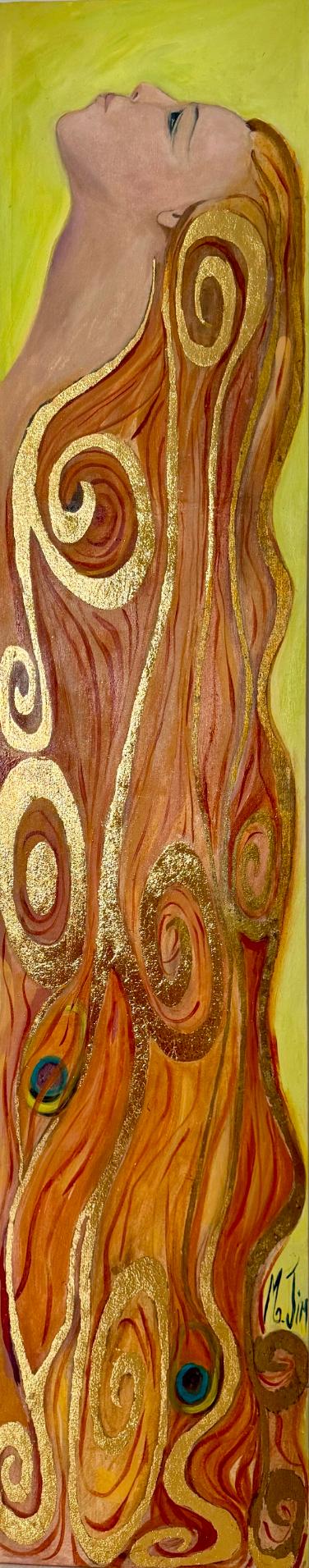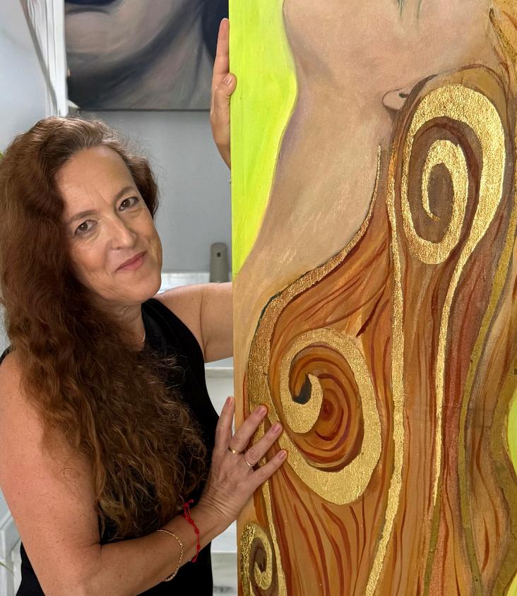 Her creations are not mere representations; they are windows into a universe. Her portraits do not seek only to capture someone’s identity. Sometimes the gaze is not direct;theeyesmaybeclosed.Atothertimes,the gaze is direct and challenging. Hair is not just hair. It lengthens, it flows, it becomes something else. Sometimes it resembles water, sometimes wind; at times, it seems to grow like the roots of a tree. Colors are not chosen at random. Blue evokes oceans, lakes, dreams… There is something that does not fully belong to this world. And gold is not a color, but a vibration, a guiding thread. She usually paints in large formats, using the oil painting technique.