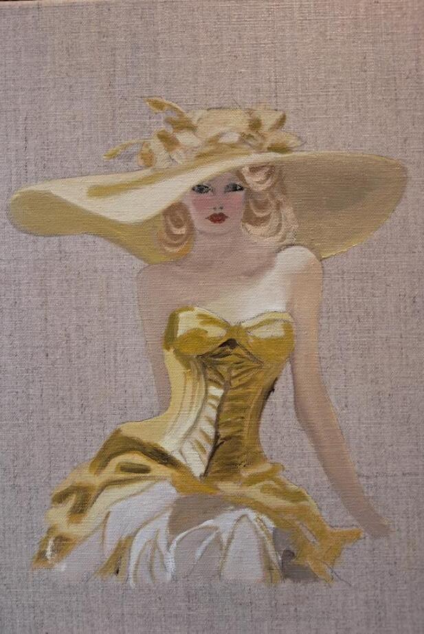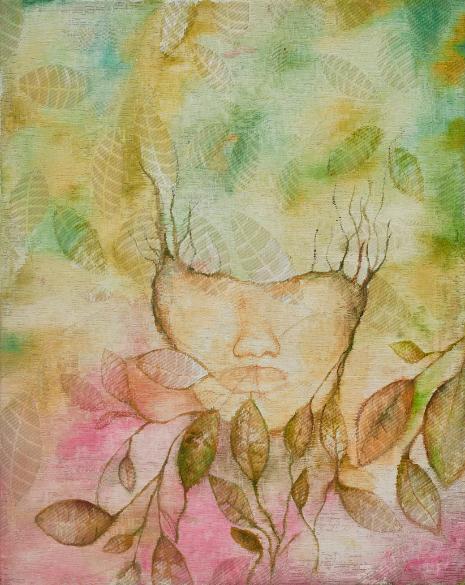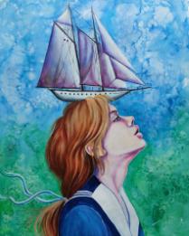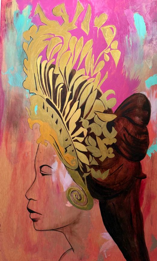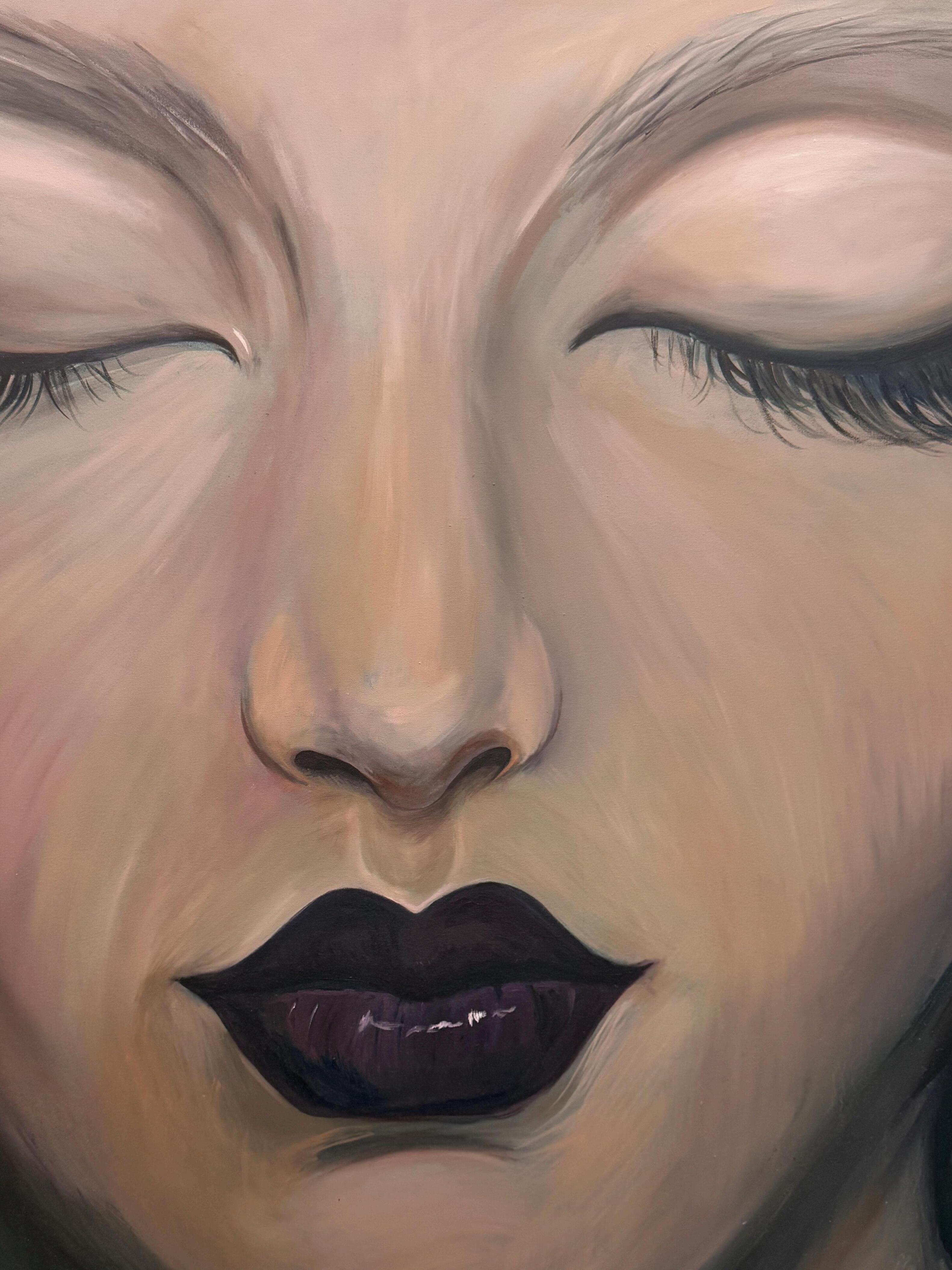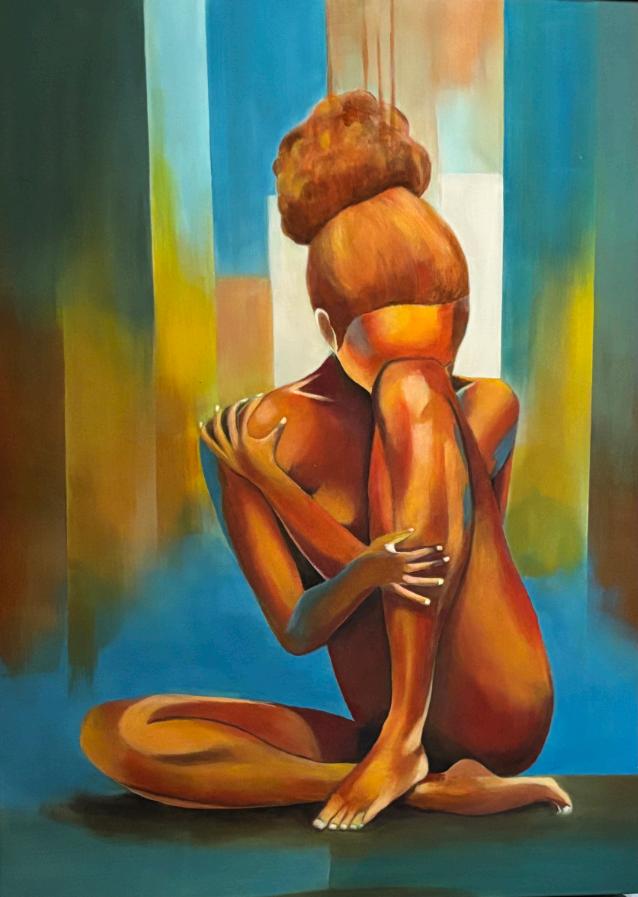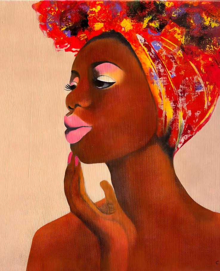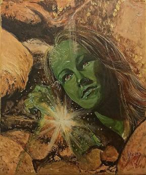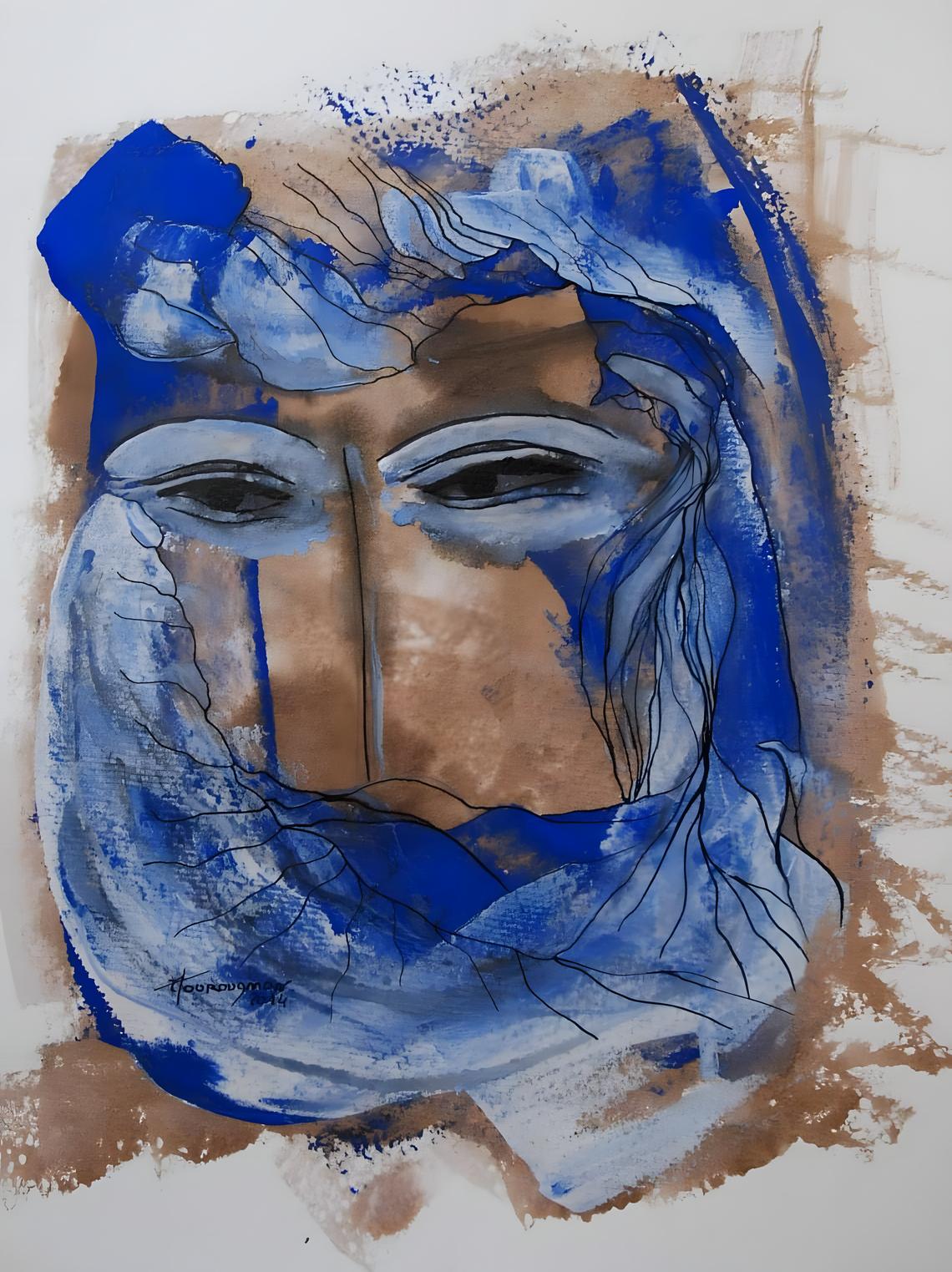 Her creations are not mere representations; they are windows into a universe. Her portraits do not seek only to capture someone’s identity. Sometimes the gaze is not direct;theeyesmaybeclosed.Atothertimes,the gaze is direct and challenging. Hair is not just hair. It lengthens, it flows, it becomes something else. Sometimes it resembles water, sometimes wind; at times, it seems to grow like the roots of a tree. Colors are not chosen at random. Blue evokes oceans, lakes, dreams… There is something that does not fully belong to this world. And gold is not a color, but a vibration, a guiding thread. She usually paints in large formats, using the oil painting technique.