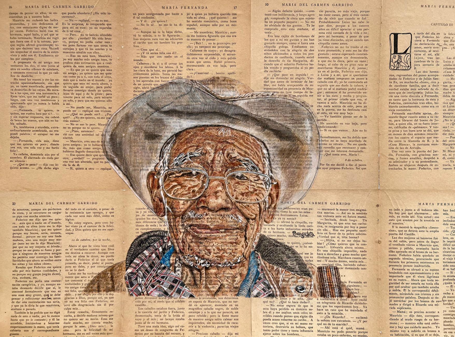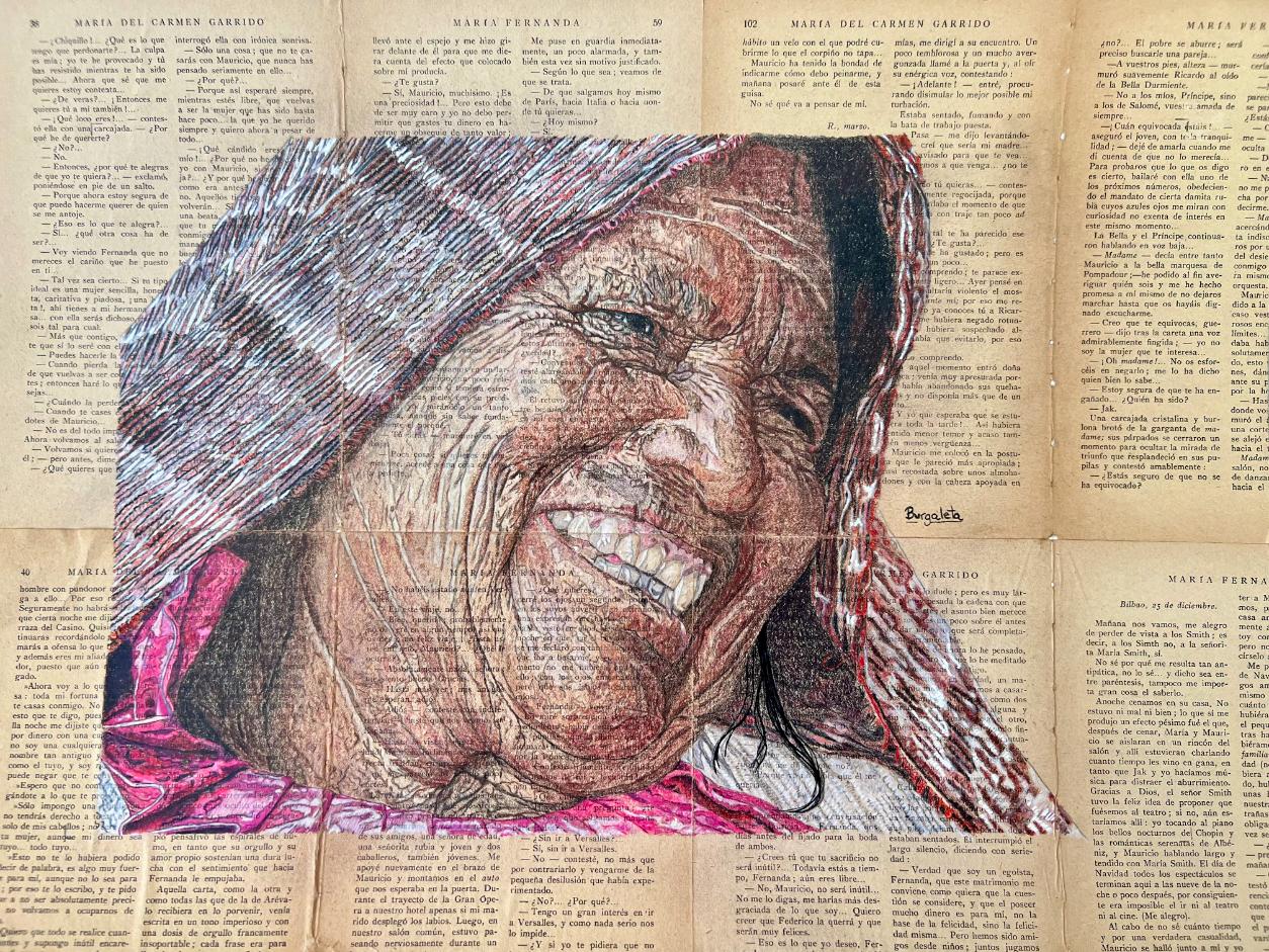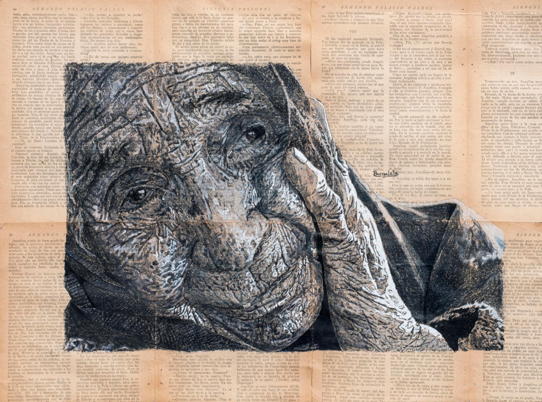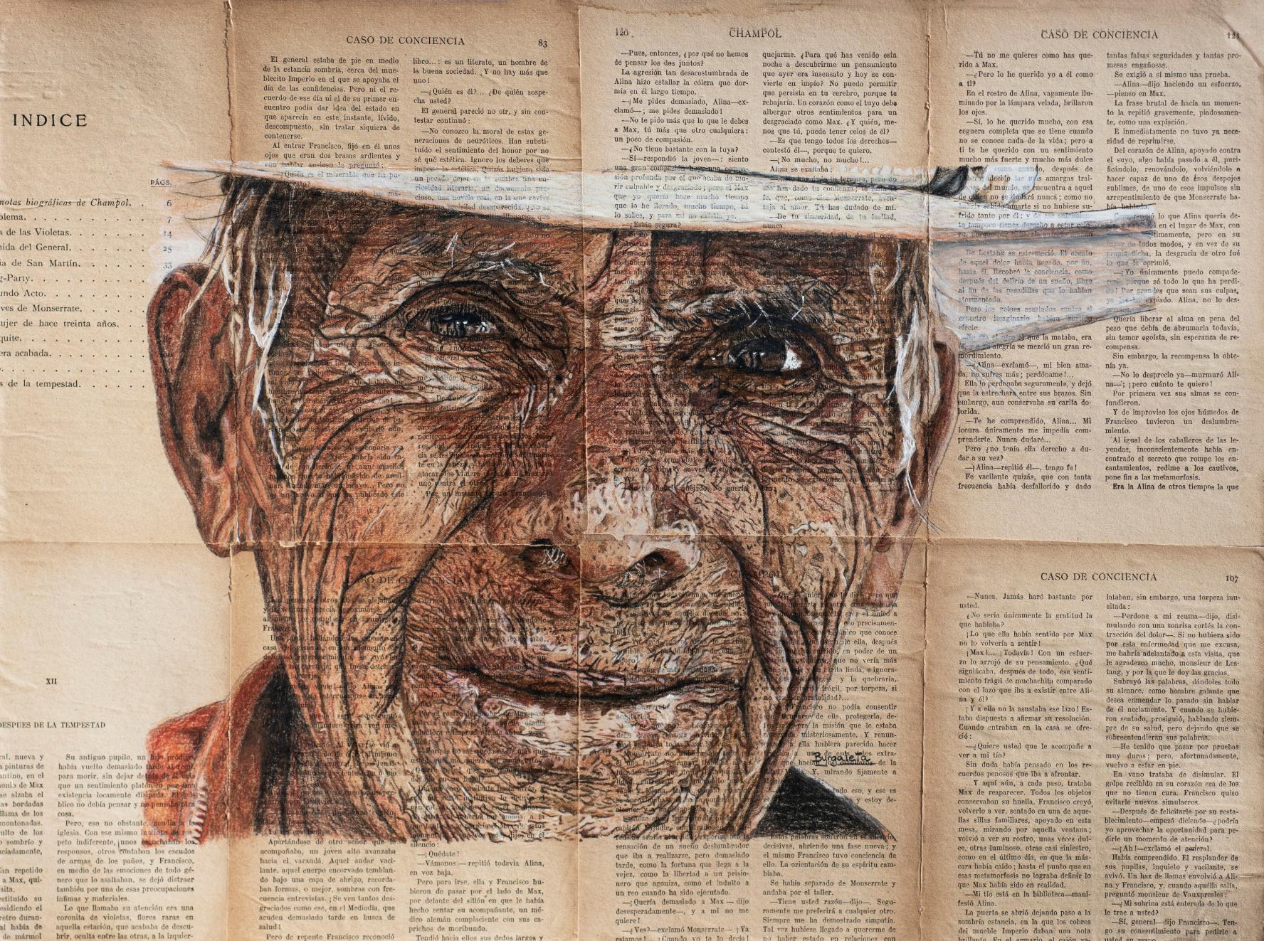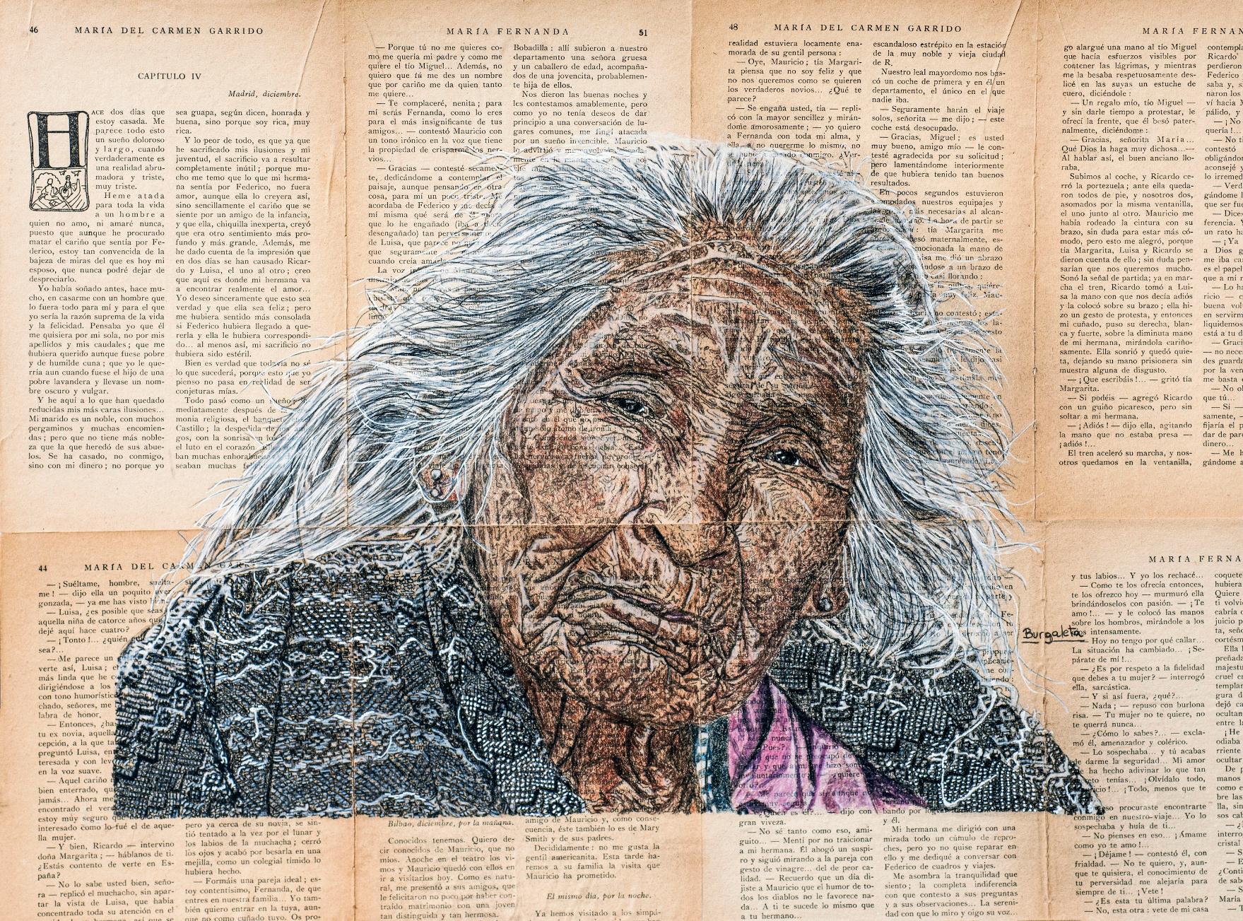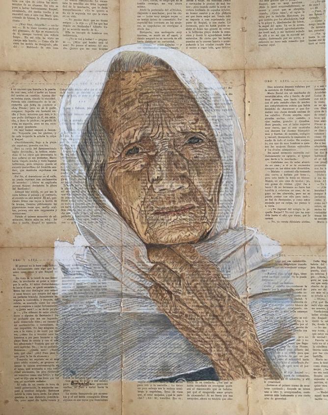 With her paintings, created on pages torn from early 20thcentury romantic novels, she establishes a striking dialogue between idealized love stories and the harsh realities faced by those living on the margins of society. Each portrait bears a name and a story, transforming anonymity into visibility. Her mission is “to make the invisible visible,” using art as a tool to awaken social awareness and empathy. Through her work, Soledad invites us to look again—at old age, at memory, at life itself—with respect and renewed sensitivity.