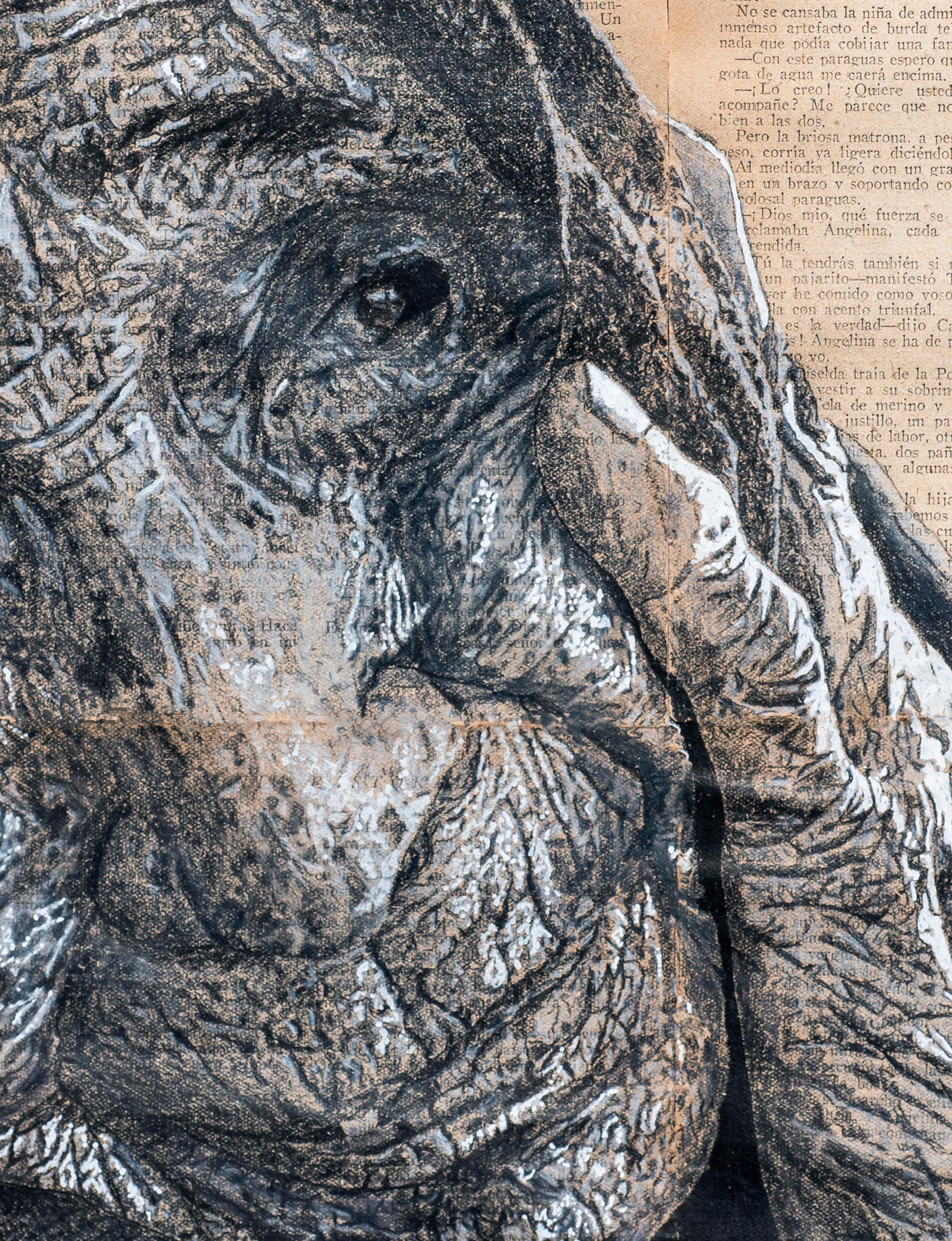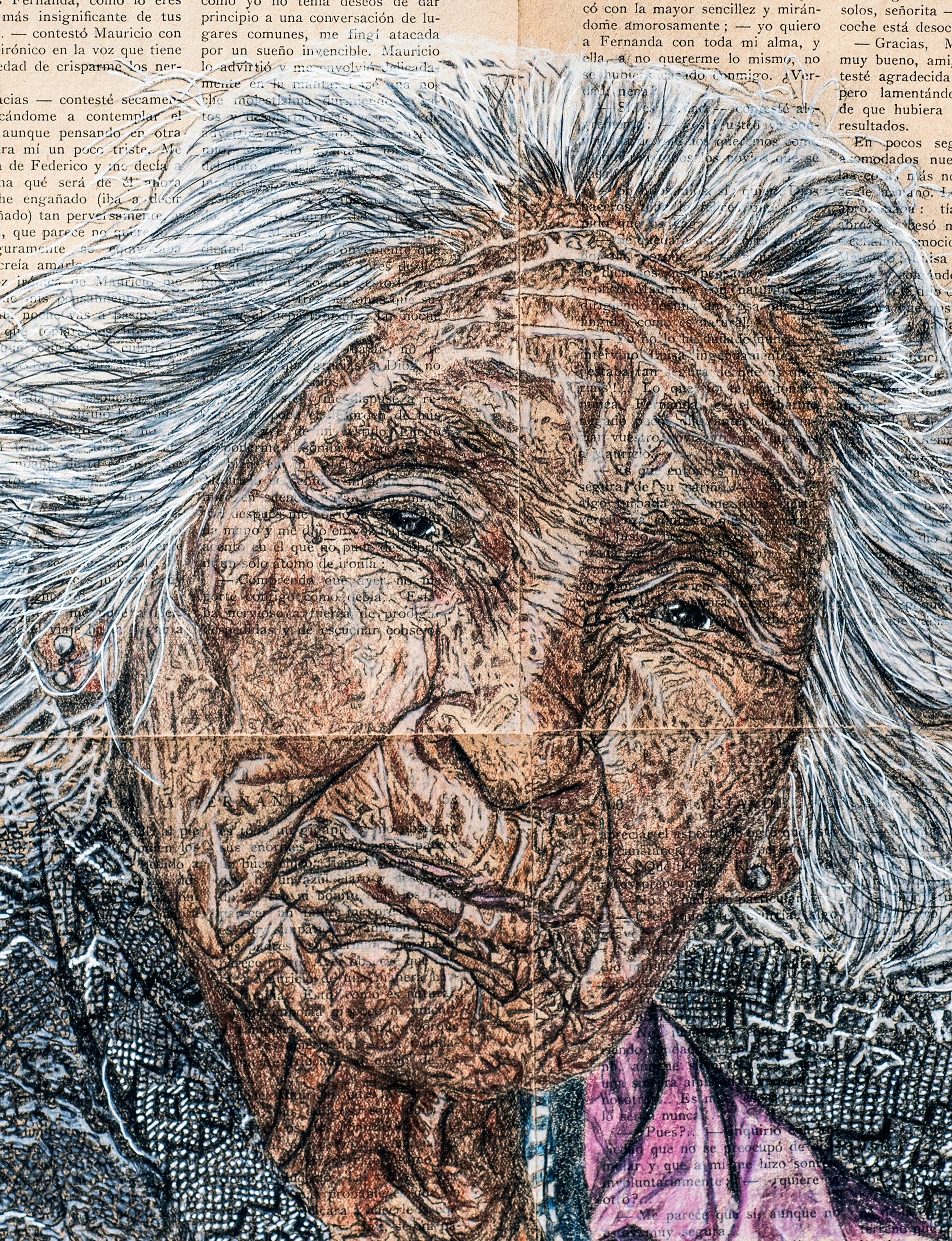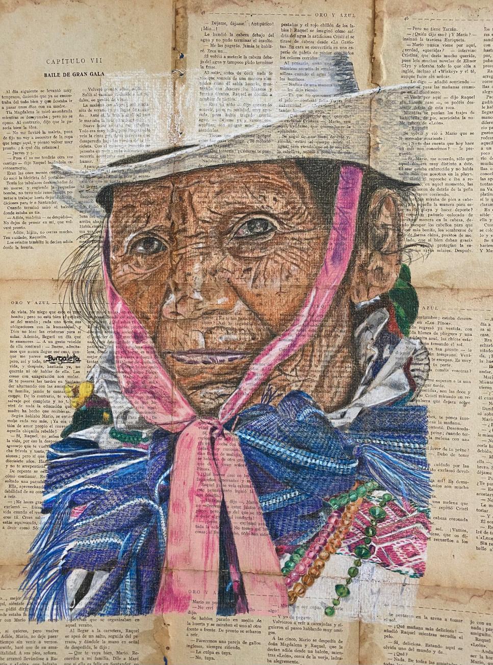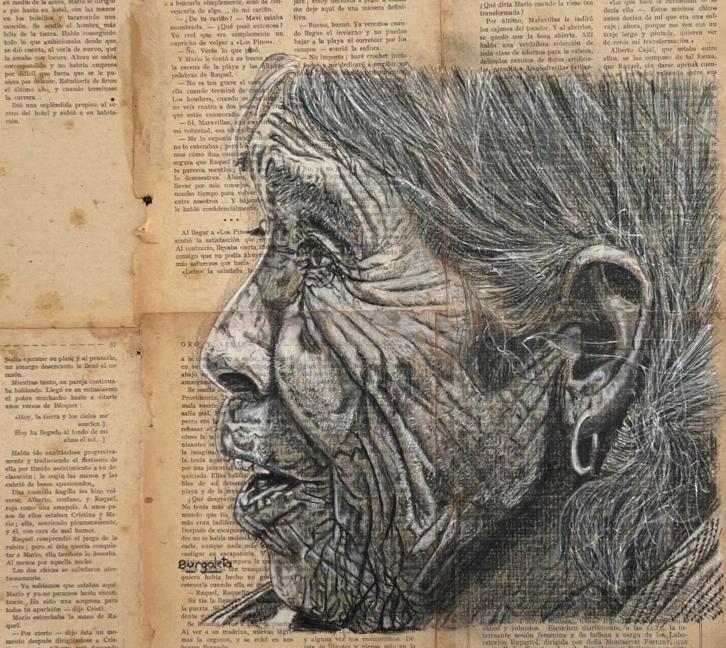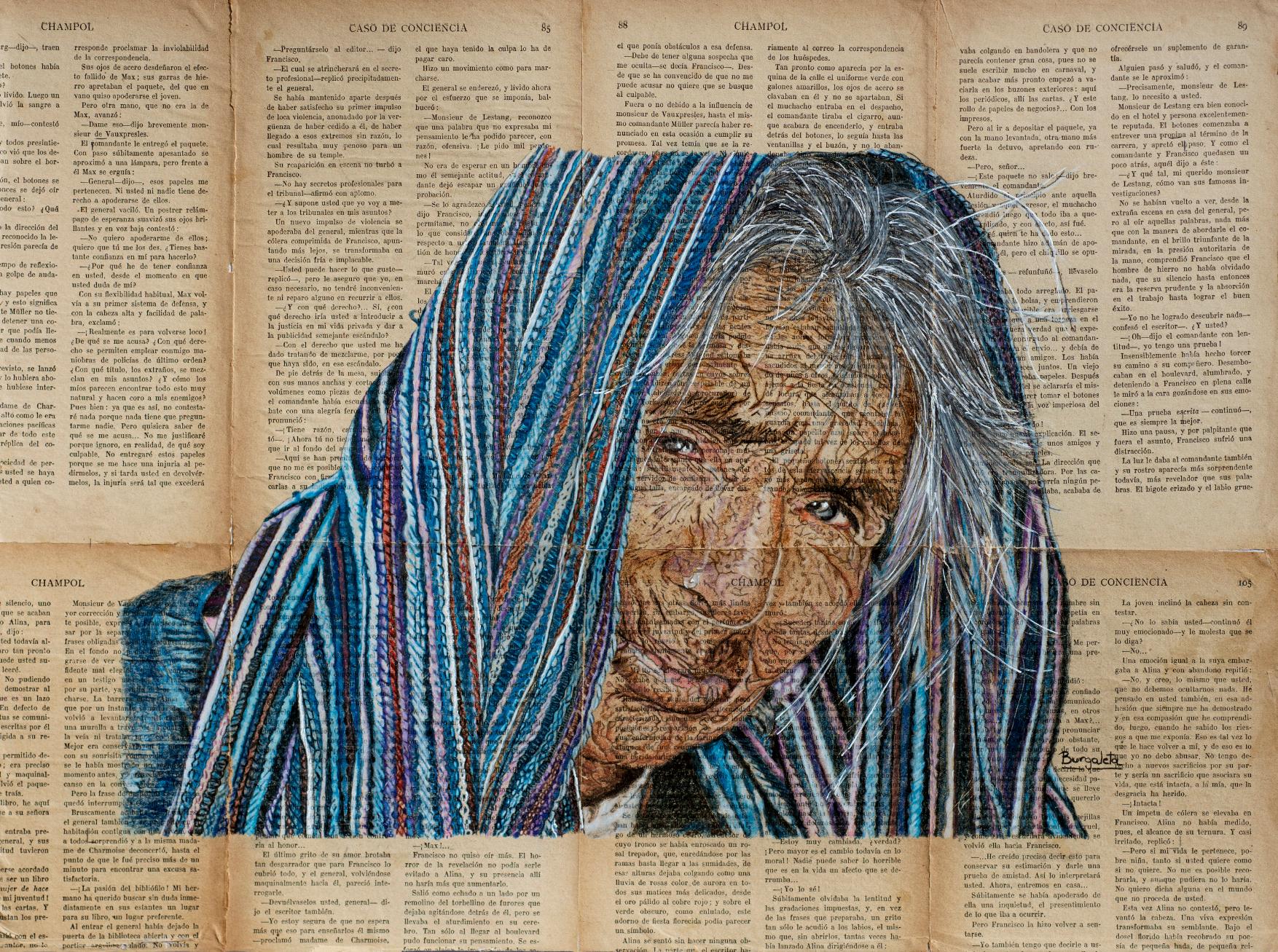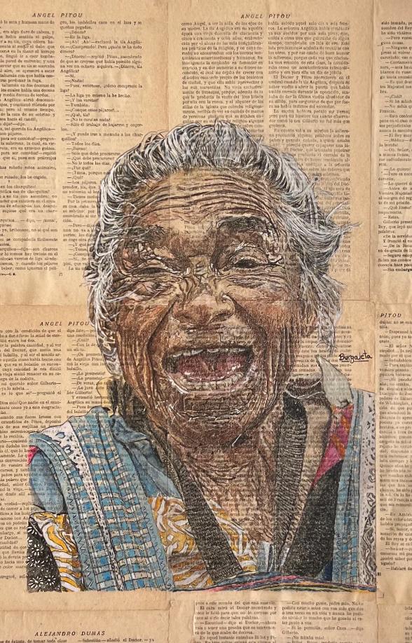 With her paintings, created on pages torn from early 20thcentury romantic novels, she establishes a striking dialogue between idealized love stories and the harsh realities faced by those living on the margins of society. Each portrait bears a name and a story, transforming anonymity into visibility. Her mission is “to make the invisible visible,” using art as a tool to awaken social awareness and empathy. Through her work, Soledad invites us to look again—at old age, at memory, at life itself—with respect and renewed sensitivity.