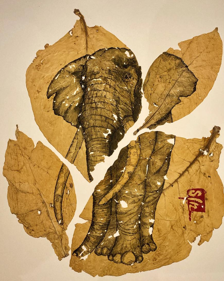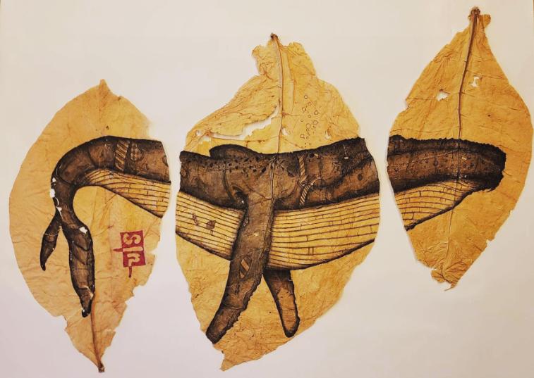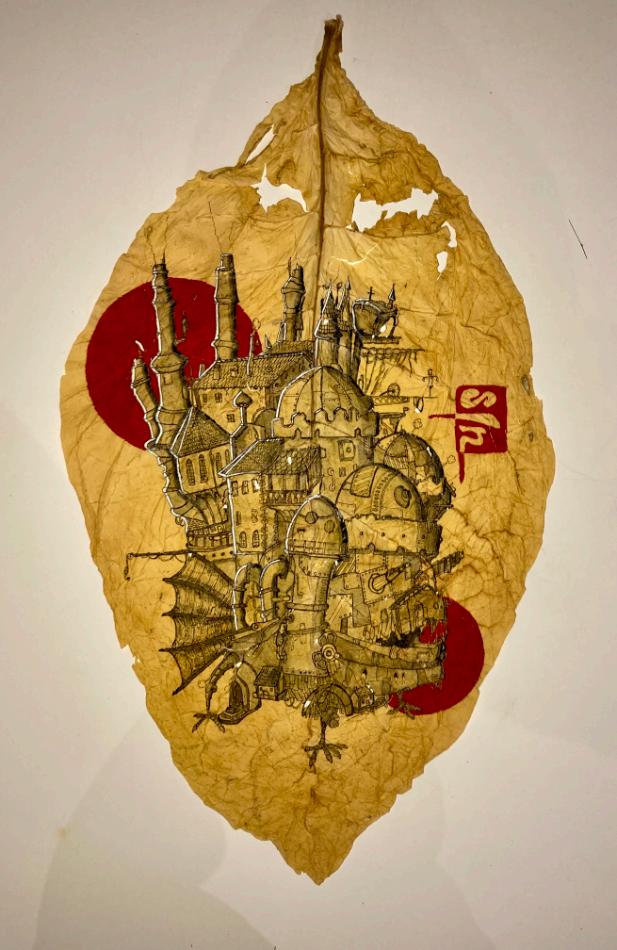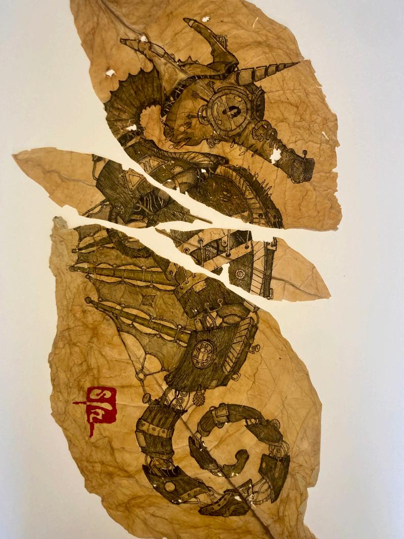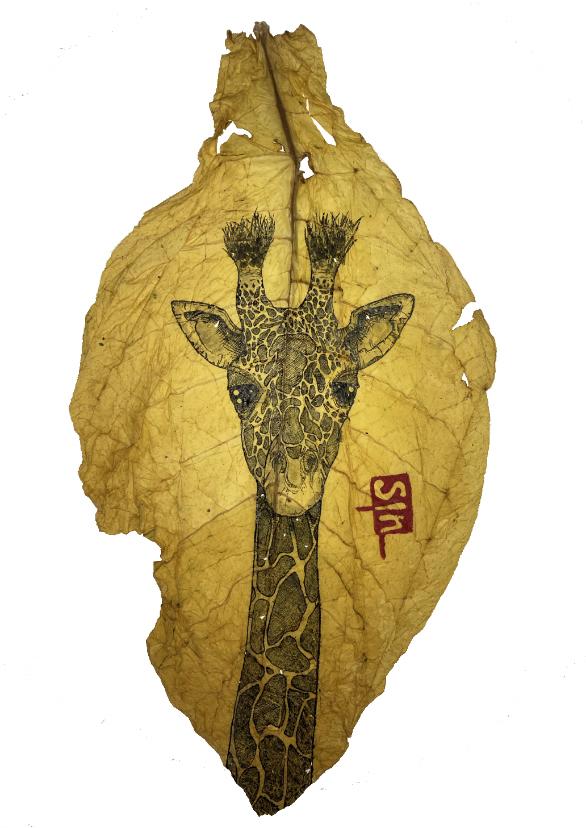 He works on tobacco leaves, an organic and plant-based material on which he applies Chinese ink, playing with light and contrast. His tools are precise: metal nibs and water-based felt pens. His creations reflect his inspirations, his travels, and his passions. His three favorite themes: Africa, its wild animals and majestic landscapes. The Ocean, its marine life and mysterious depths. The people of the grass, those astonishing and often little-known insects. He also creates fan art, including tributes to Miyazaki and to the world of pop art. Over the past four years, nearly 240 works have been born from his imagination. His signature, “sin”, is a nod to Japanese woodblock prints. The tobacco leaf,aplant-basedandlivingmaterial,evokesthe skin. The nib, a precise tool, recalls the needle. The ink, deep and black, creates lasting patterns. From this idea came the name of his artistic expression: vegetal tattooing.