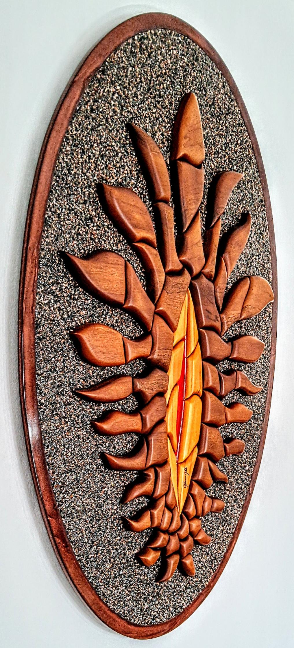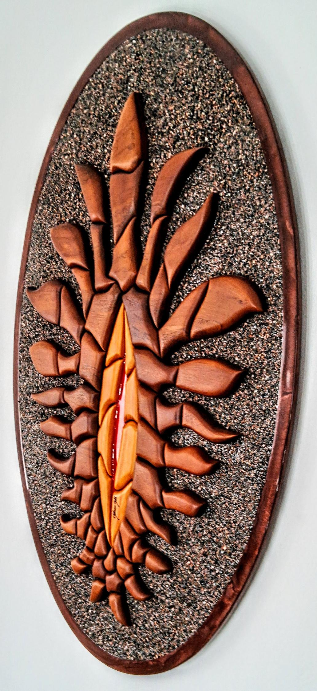 sing wood, stones, fibers, coconut endocarp, resins, repurposed glass, and even remnants from his own production, he builds works that honor the memory of these materials and transform them into symbols of resilience. With an optimistic outlook, his pieces explore the duality of life, translating pain and scars into overcoming and into the constant search for light. Each artwork is a passage: life’s hardness meets rebirth. Melo’s art, rooted in tradition, projects a timeless message. It reminds us that even amid adversity, there will always be a spark to illuminate our path.