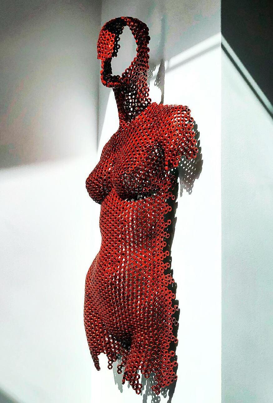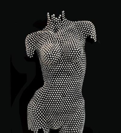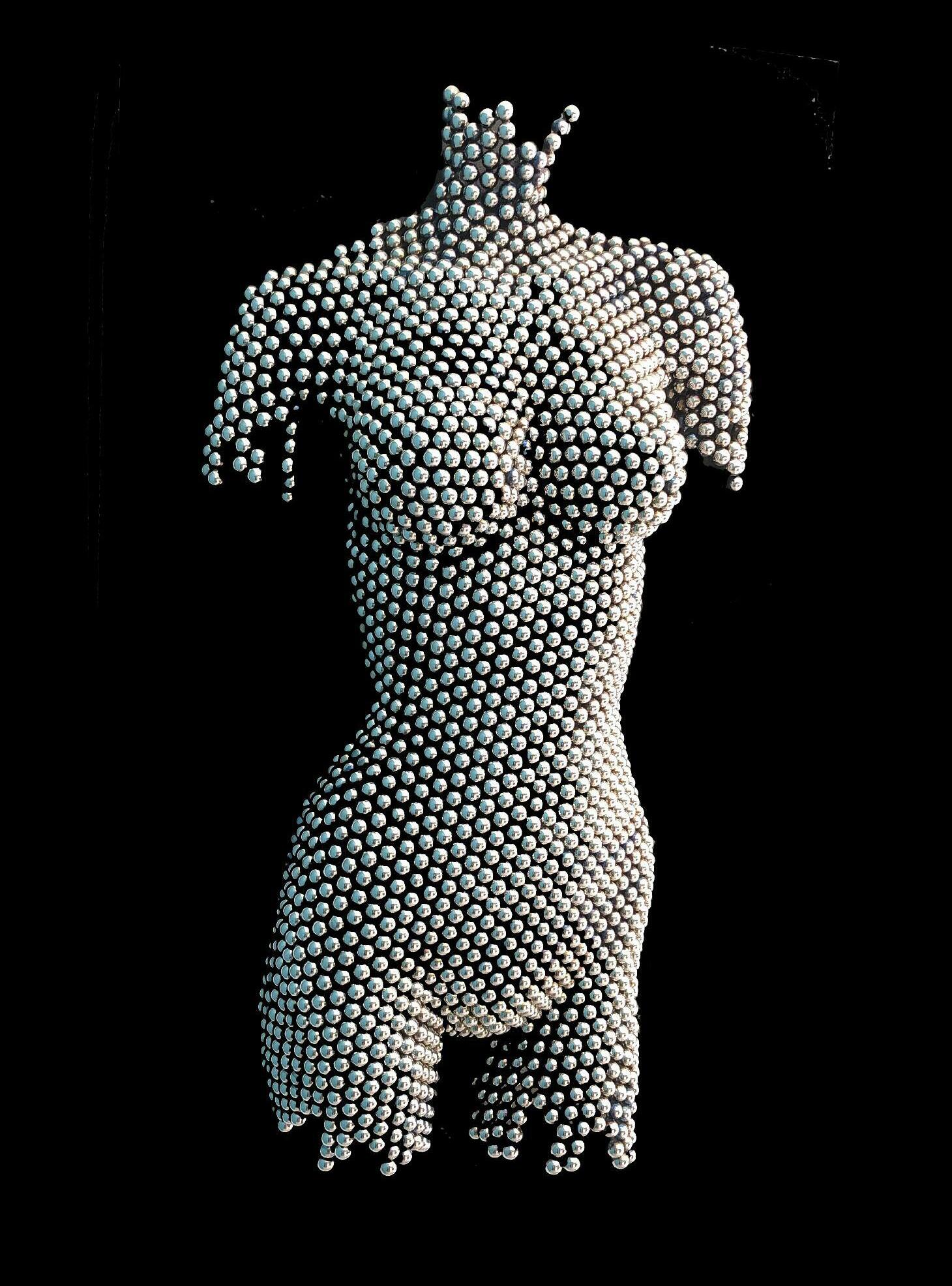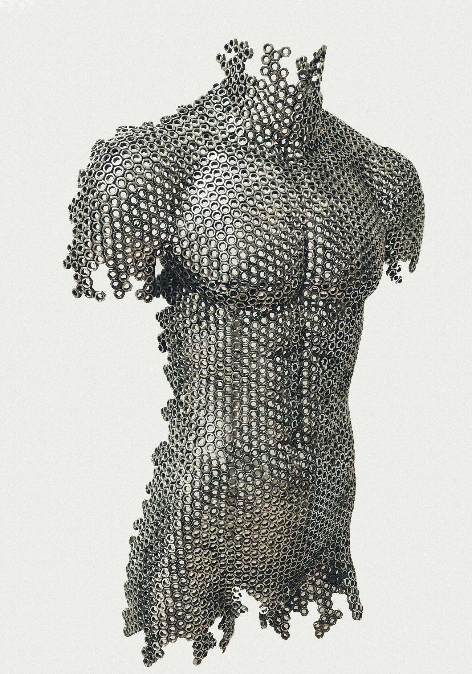 Ses réalisations se concentrent sur le travail du corps par la réalisation des ses bustes avec des matériaux simples et bruts en acier, comme les écrous et maintenant ses perles d’acier chromées