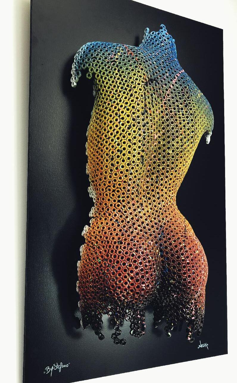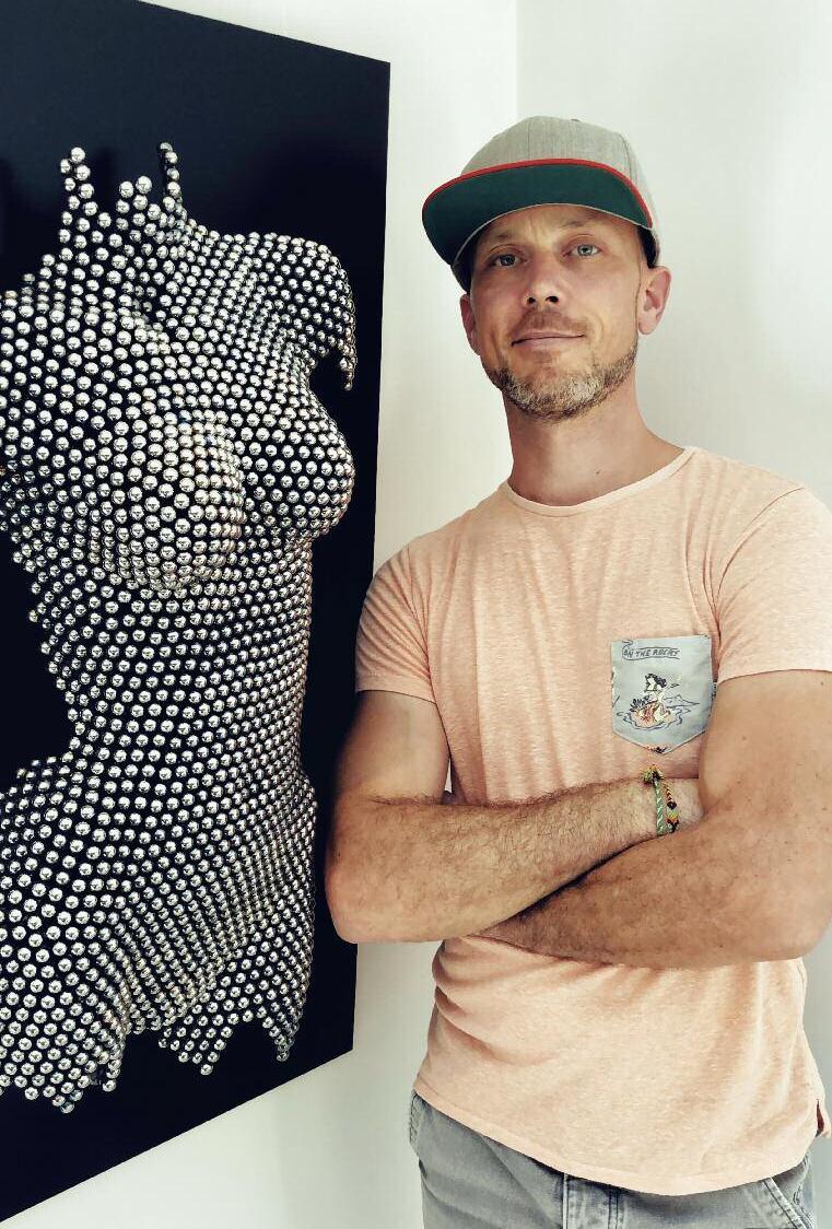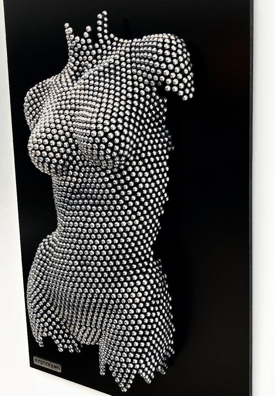 Ses réalisations se concentrent sur le travail du corps par la réalisation des ses bustes avec des matériaux simples et bruts en acier, comme les écrous et maintenant ses perles d’acier chromées