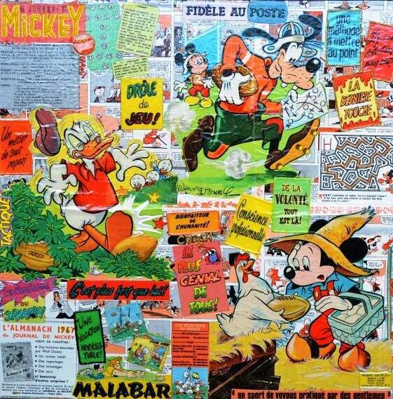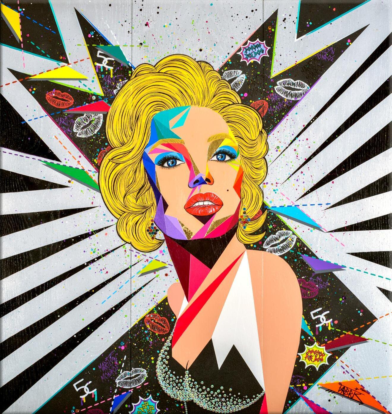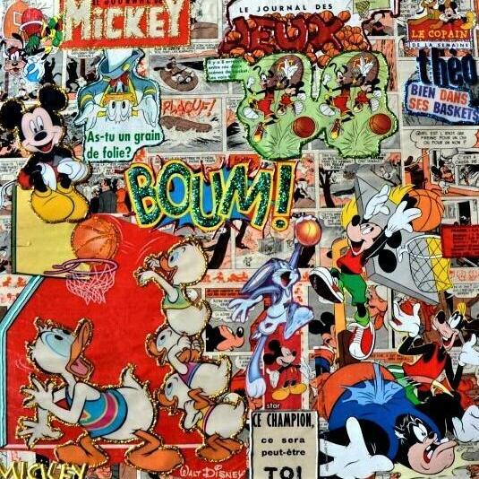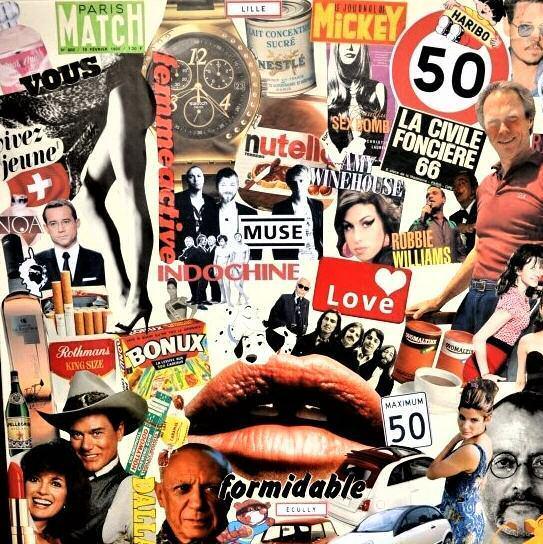 TECHNIQUE : Recherche des visuels dans le stock, découpage au scalpel et photocomposition du tableau, collages des visuels sur châssis toile« pro » 3D, vernissage du tableau pour redonner de l’éclat aux couleurs, travail de customisation peinture 3D nacrée-pailletée puis final de zones rehaussées en résine époxy translucide