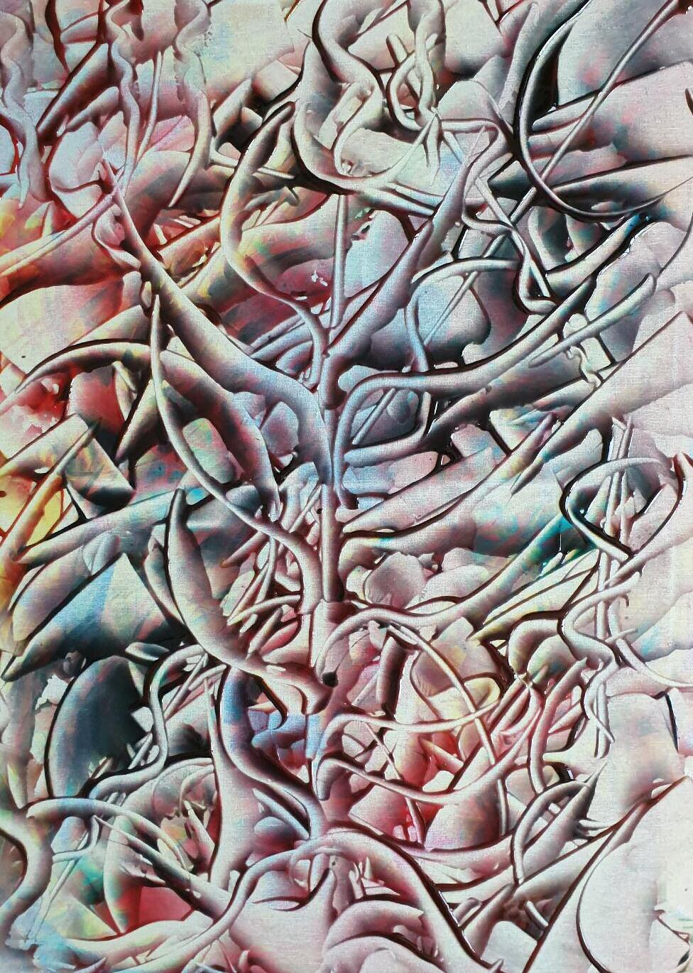 Seul le présent m'importe, les évènements n'ont pas toujours de prise, comme en dehors du temps. Dans une dimension fractale ma peinture ressemble à mes journées