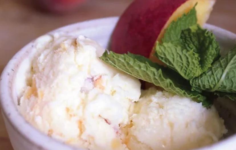 8. Right before the ice cream is firm, add the chopped peaches. Finish processing until firm and serve.