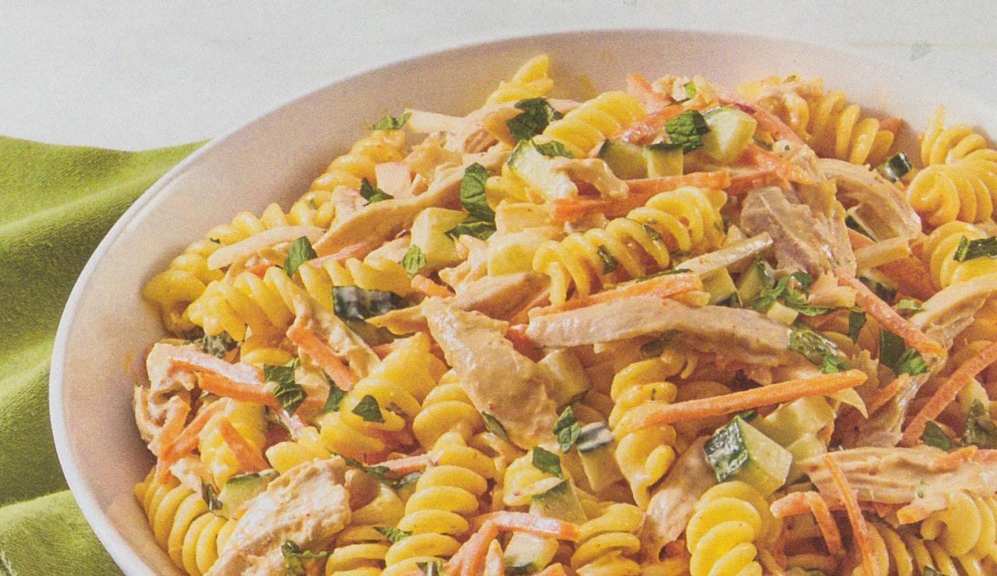 Toss pasta, chicken, dressing and pickled vegetables. Add cucumbers, mint and cilantro, toss to combine.