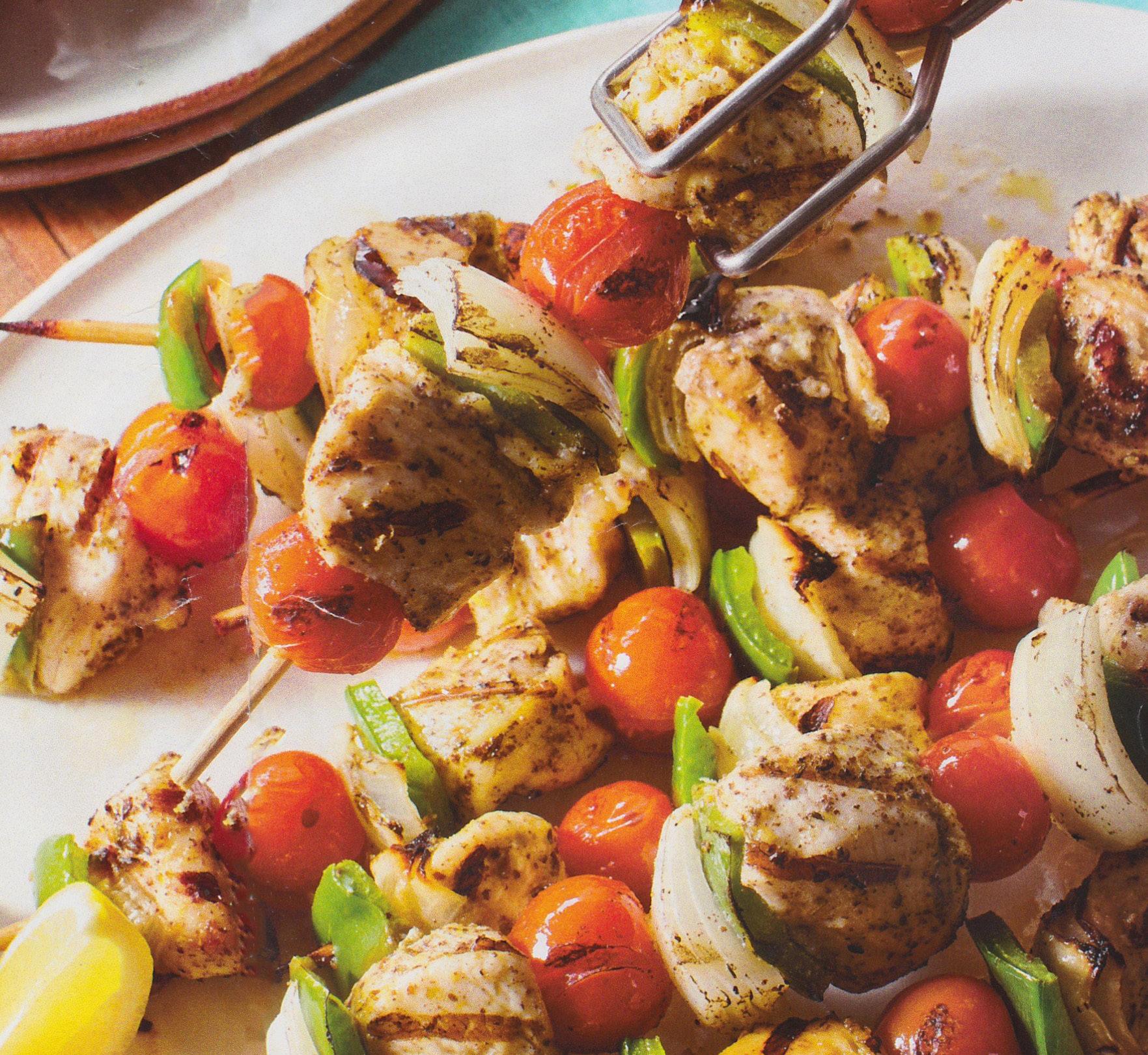 4. Heat grill or grill pan to high heat. Grill skewers for 10 minutes, rotating every few minutes to ensure even cooking, until chicken reaches safe internal temperature of 165 F and veggies have charred and softened. Serve with lemon wedges.