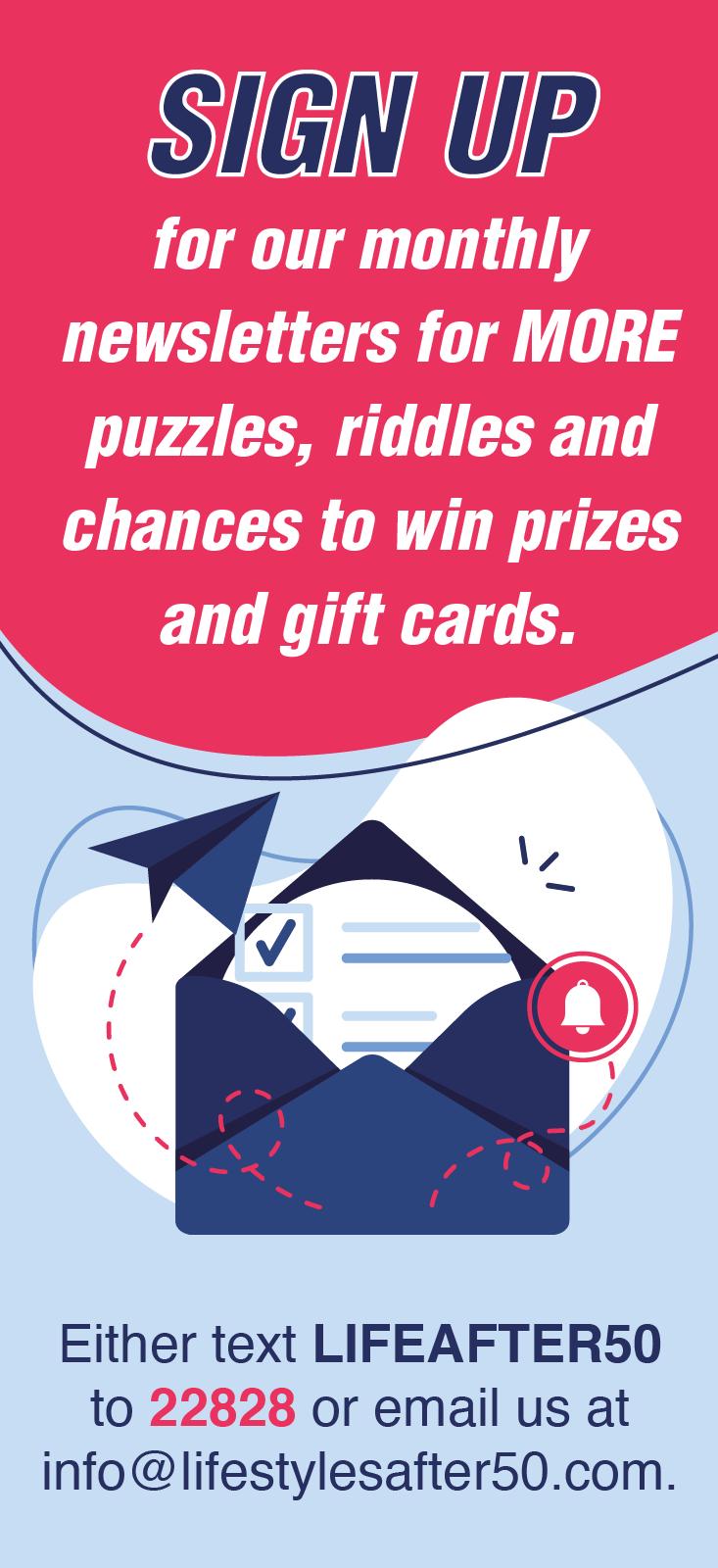Send your answers along with your name, address, email and telephone number to: LIFESTYLES AFTER 50 P.O. BOX 638, SEFFNER, FL 33583